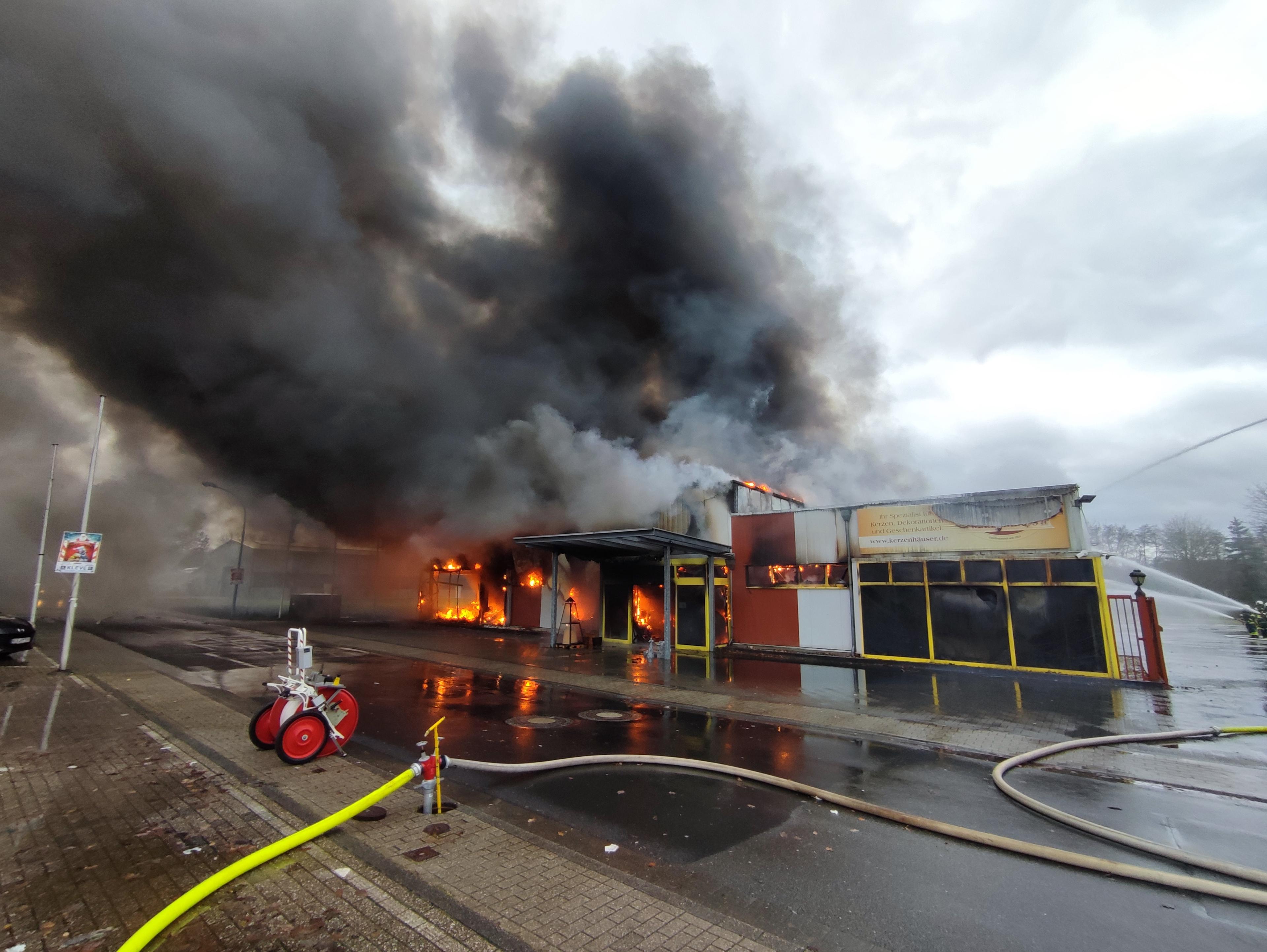 Zu einem Gebäudebrand eines Fachmarktes für Kerzen, Dekorationen und Geschenkartikel an der Bedburger Weide wurde am Samstag (23.12.2023) um 13:27 Uhr die Freiwillige Feuerwehr Bedburg-Hau alarmiert. Die Betriebseigentümer hatten den Brand im hinteren Bereich, einer an den Verkaufsräumen angebauten Halle bemerkt und den Notruf gewählt. Mitarbeitende und Kunden, die sich zum Brandausbruch in den Verkaufsräumen befanden, konnten sich rechtzeitig in Sicherheit bringen.