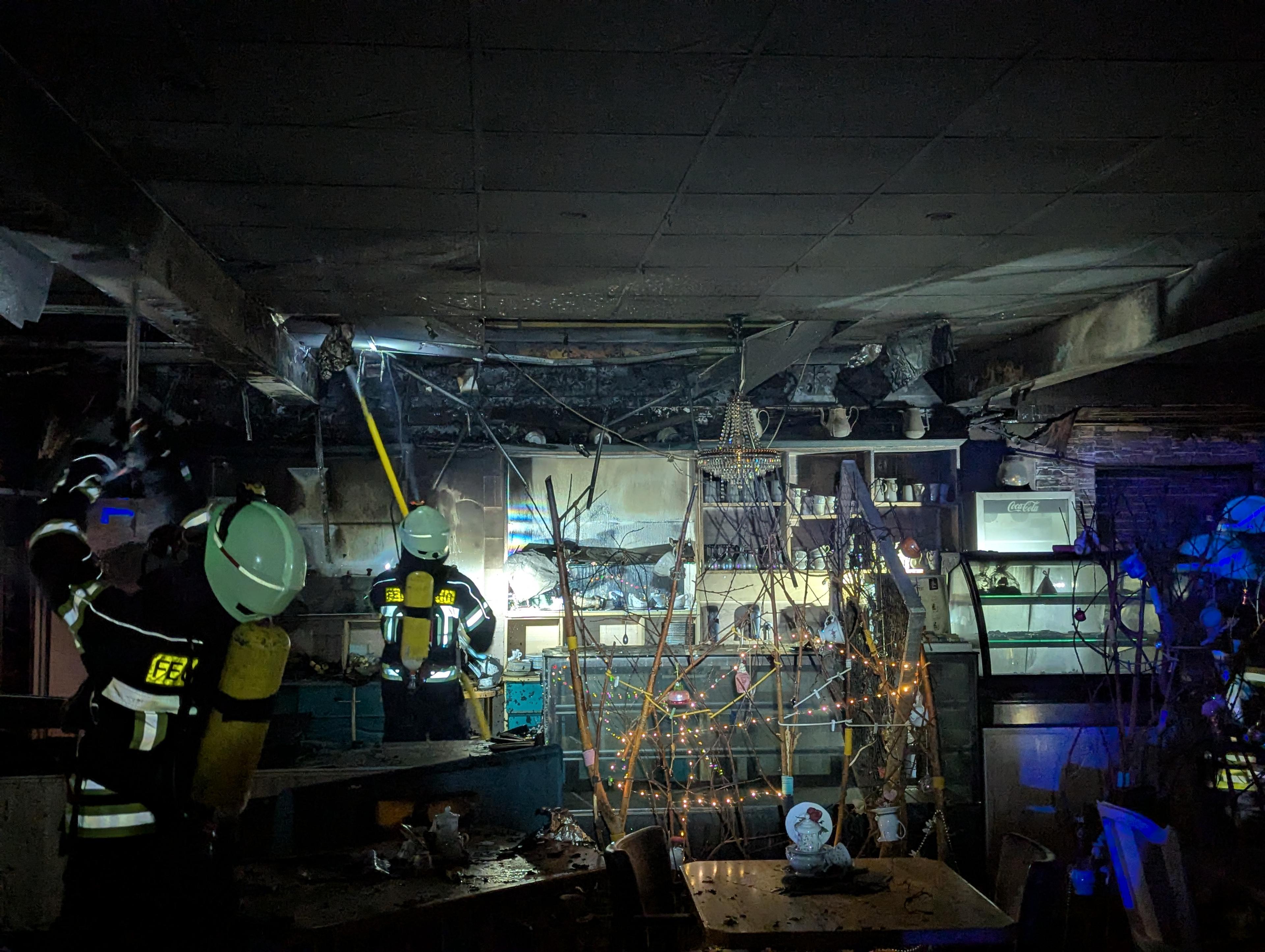 Nachdem sich gewaltsam Zugang zum Erdgeschoss geschaffen worden war, drangen zwei Angriffstrupps unter schwerem Atemschutz in das Gebäude ein. Im Bereich einer Verkaufstheke war das Feuer ausgebrochen und hatte sich in die Zwischendecke und in eine Wandkonstruktion ausgebreitet. Nachdem der Brand gelöscht wurde, mussten Decken- und Wandteile entfernt werden, um Glutnester abzulöschen. Durch die starke Rauchausbreitung waren 13 Atemschutztrupps in dem verwinkelten Gebäude eingesetzt, um mögliche weitere Brandherde auszuschließen.
