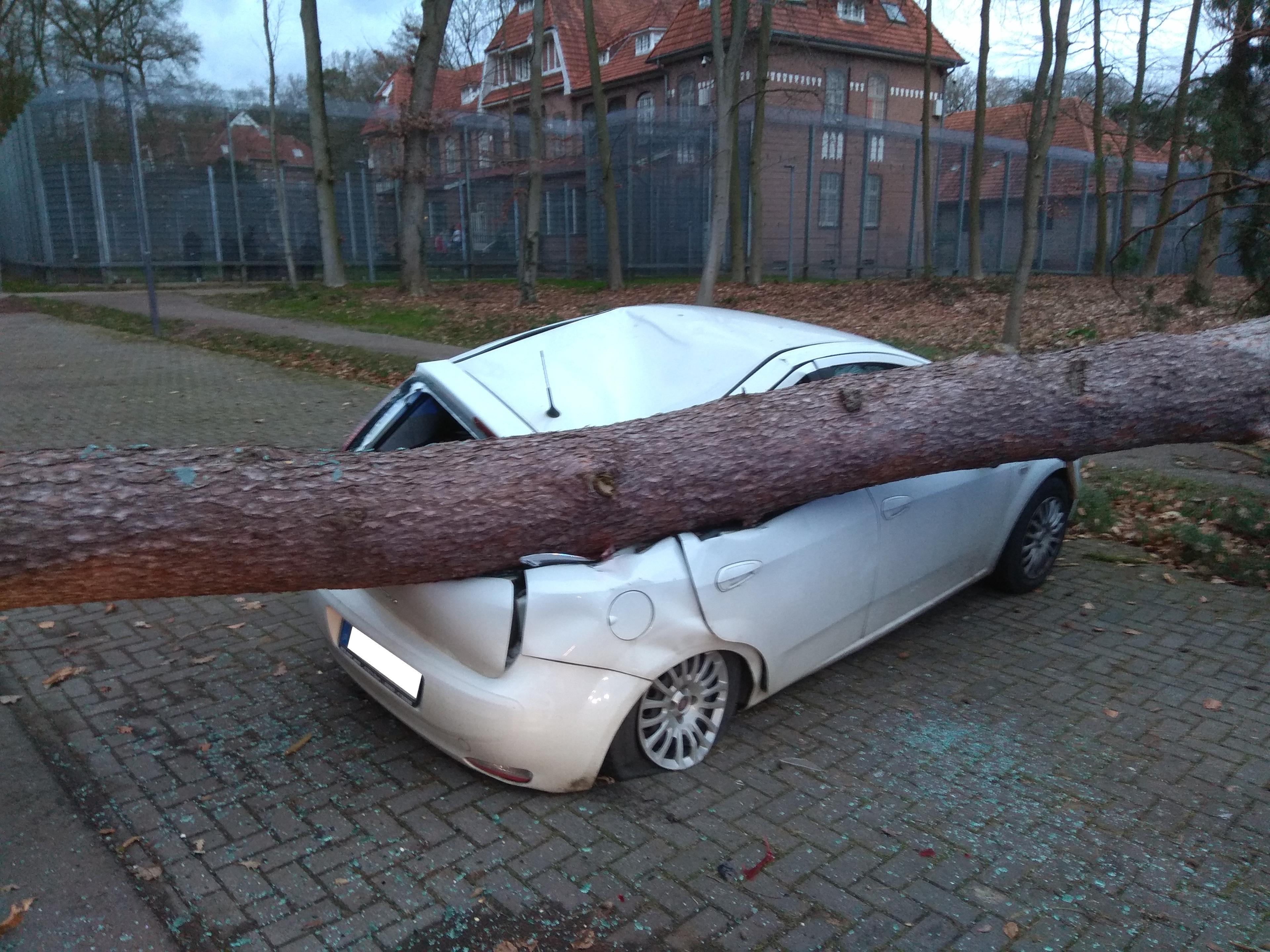 Durch die heftigen Sturmböen war eine Kiefer umgestürzt und begrub einen Fiat Punto unter sich. Dieser war von einer Mitarbeiterin auf einem Parkplatz abgestellt worden. Der umgestürzte Baum machte die angrenzende Straße unpassierbar. Verletzt wurde niemand.