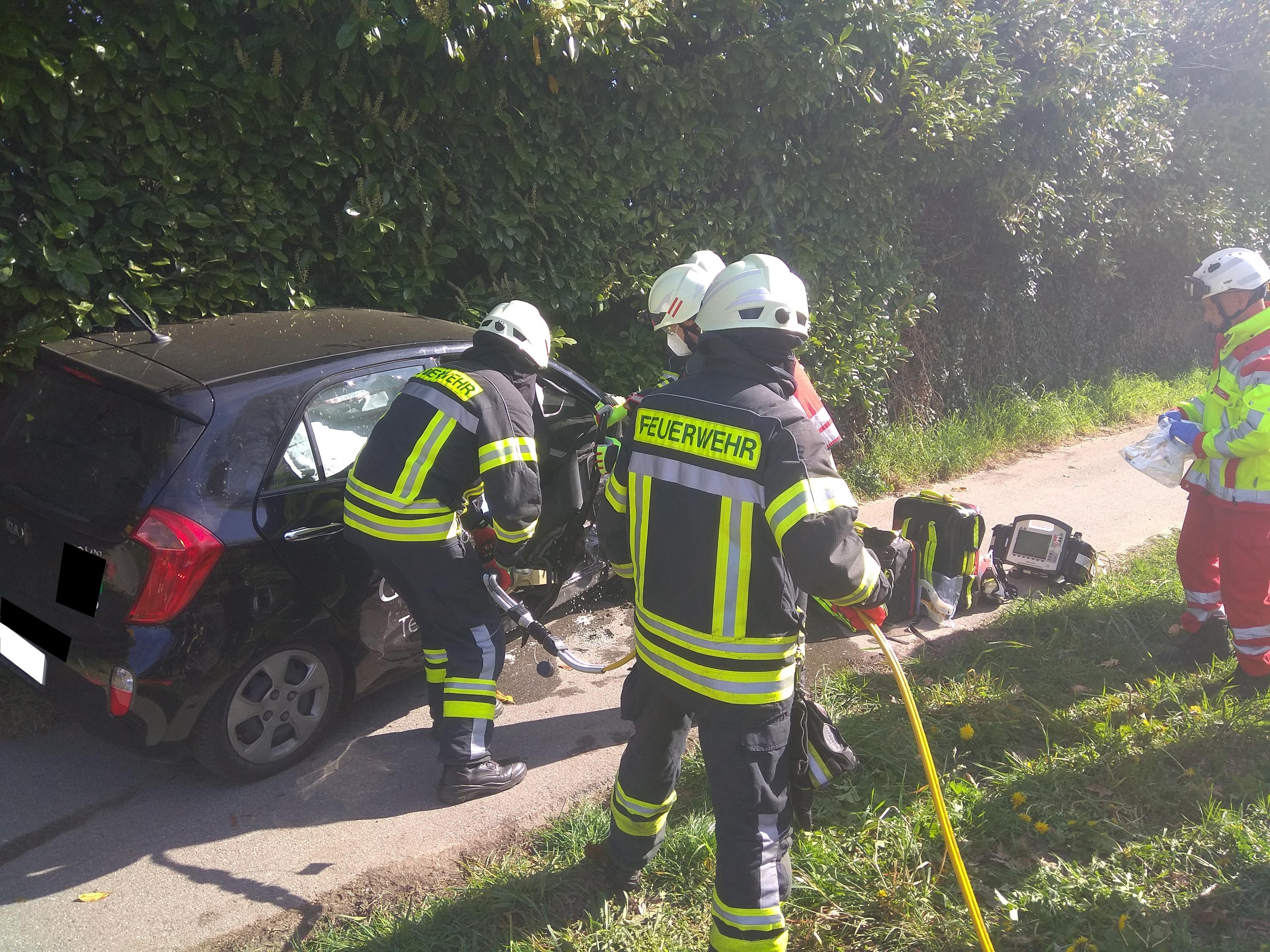 Wie es zu dem Unfall kam ist unbekannt. Im Kreuzungbereich war ein ein aus Fahrtrichtung Uedem kommendener VW SUV mit einem KIA Kleinwagen eines ambulanten Pflegedienstes, der die Kreuzung vom Johann-van-Aken-Ring aus Hau kommend Richtung Schneppenbaum überqueren wollte zusammengestossen. Durch die Wucht des Aufpralls wurde der Kleinwagen über die Kreuzung gegen einen Zaun geschleudert. Die zwei Insassen des VW, ein Vater mit seiner Tochter, konnten das Fahrzeug selbständig verlassen. Die Mitarbeiterinnen des Pfegedienstes wurden mit hydraulischem Rettungsgerät durch die Feuerwehr aus dem Fahrzeug befreit.