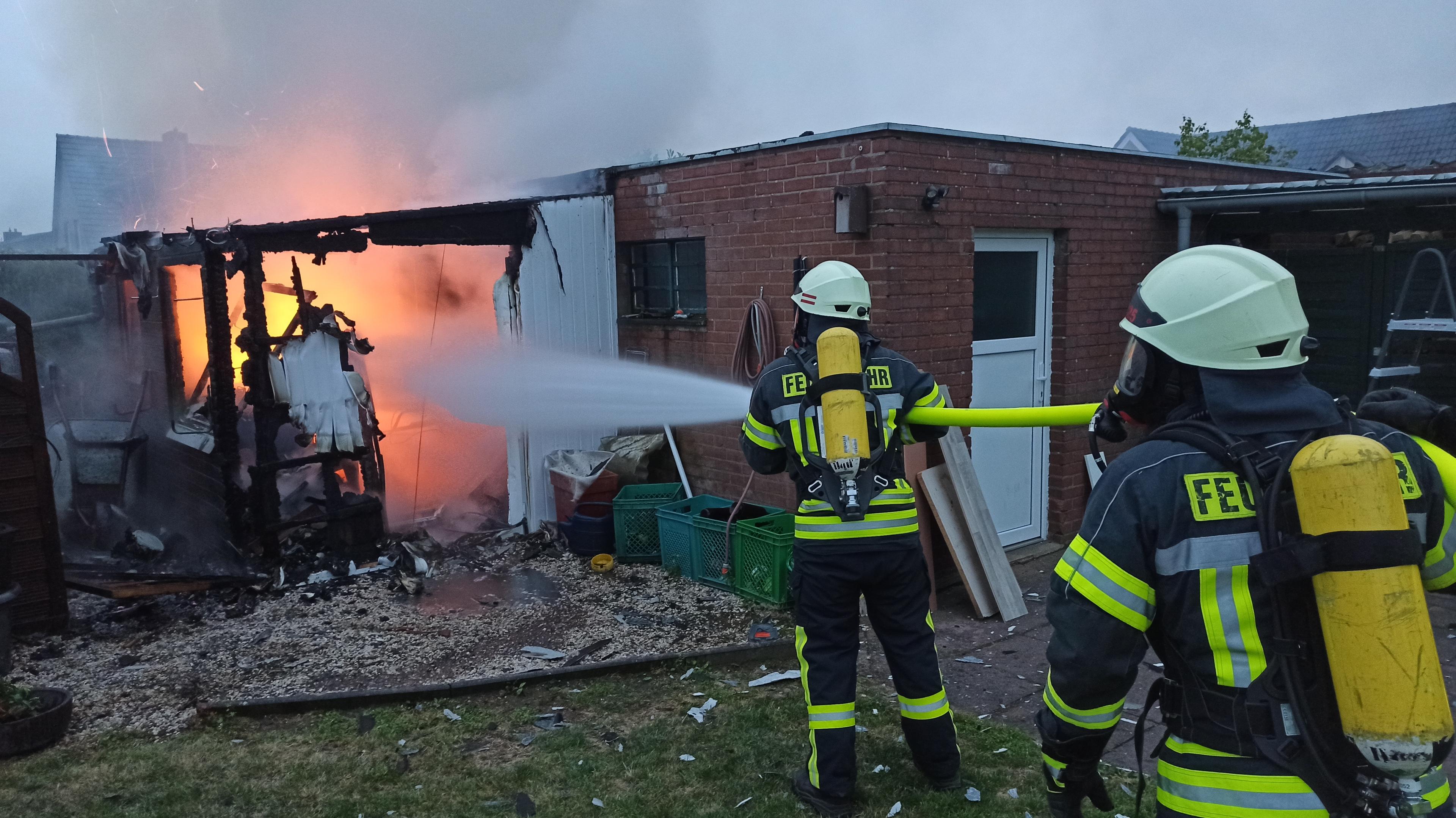 Zu einem Brand eines Kleingebäudes wurde heute (10.06.2020) um 04:58 Uhr die Freiwillige Feuerwehr Bedburg-Hau sowie der Rettungsdienst des Kreises Kleve alarmiert. An der Karl-Müller-Straße in Hau war aus unbekannter Ursache ein Holzanbau einer Garage in Brand geraten. Ein Nachbar hatte durch laute Geräusche den Brand bemerkt und die Feuerwehr alarmiert. Ebenso informierte er den Eigentümer. Beim Eintreffen der Einsatzkräfte stand der Anbau in Vollbrand. Eingelagert waren dort Gartengeräte, Pooltechnik sowie eine leere Gasflasche. Unter schwerem Atemschutz konnten zwei Angriffstrupps den Brand schnell unter Kontrolle bringen und ein Übergreifen verhindern. Für die Zeit der Löscharbeiten war die Karl-Müller-Straße gesperrt. Die Höhe des entstandenen Sachschadens ist nicht bekannt. Verletzt wurde niemand.