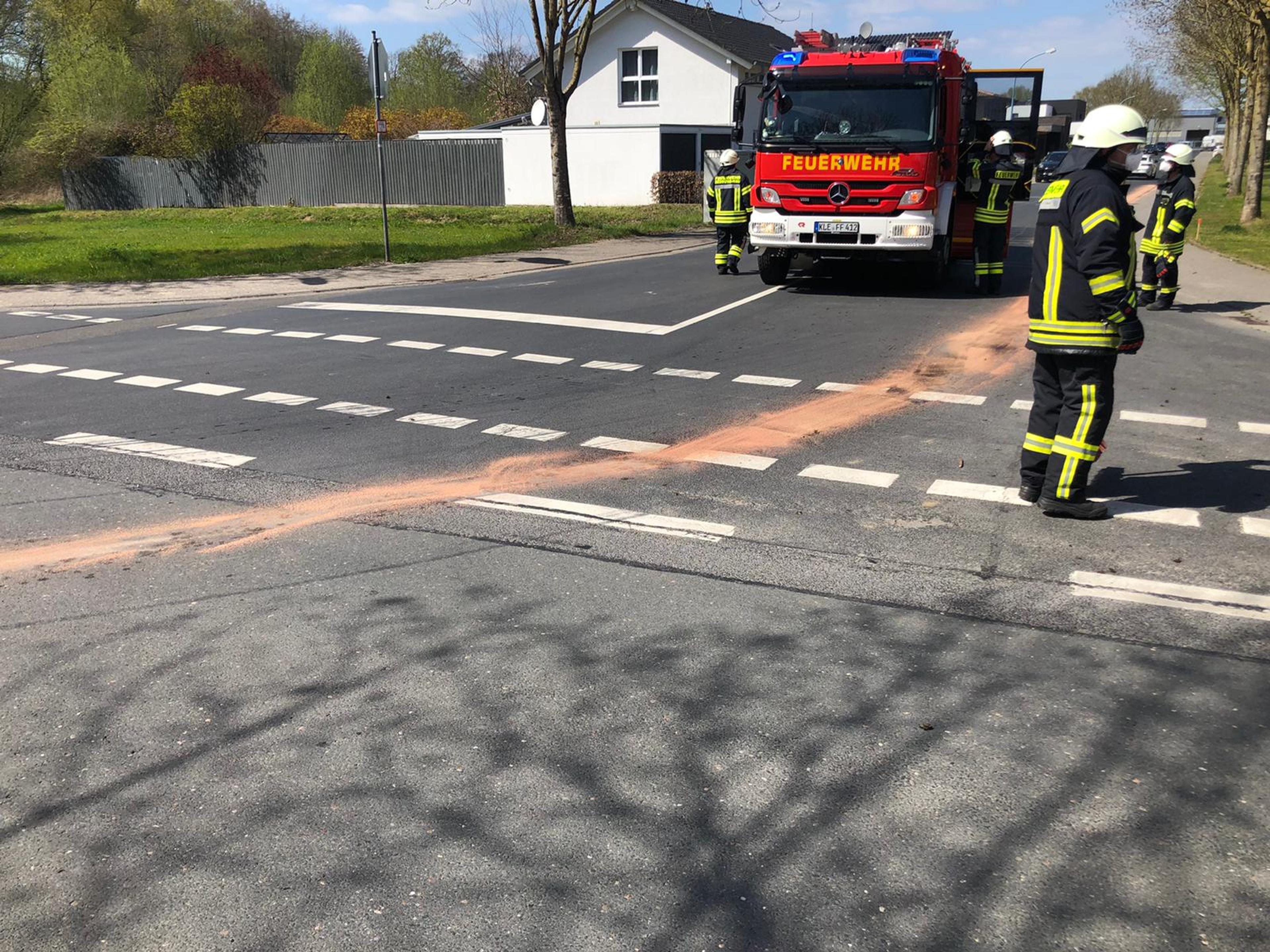 Ein LKW eines Garten und Landschaftsbauers hatte einen Kanister oder Tank mit Diesel auf der Ladefläche, welche sich wohl während der Fahrt gelöst hat oder umgekippt ist. So hat sich der Diesel über die Ladefläche verteilt bzw. auf die Straße. Aufgefallen ist dem Fahrer das erst, auf dem Gelände eines Baustoffhandels. Nach Rücksprache und Anordnung der Polizei wurde die Ölspur abgestreut. Es waren mehrere Gefahrenstellen, welche sich über folg. Straßen lang zogen. Bedburger Weide , An der Molkerei , Bedburger Weg, Rosendaler Weg , Uedemerstr. , Alte Bahn