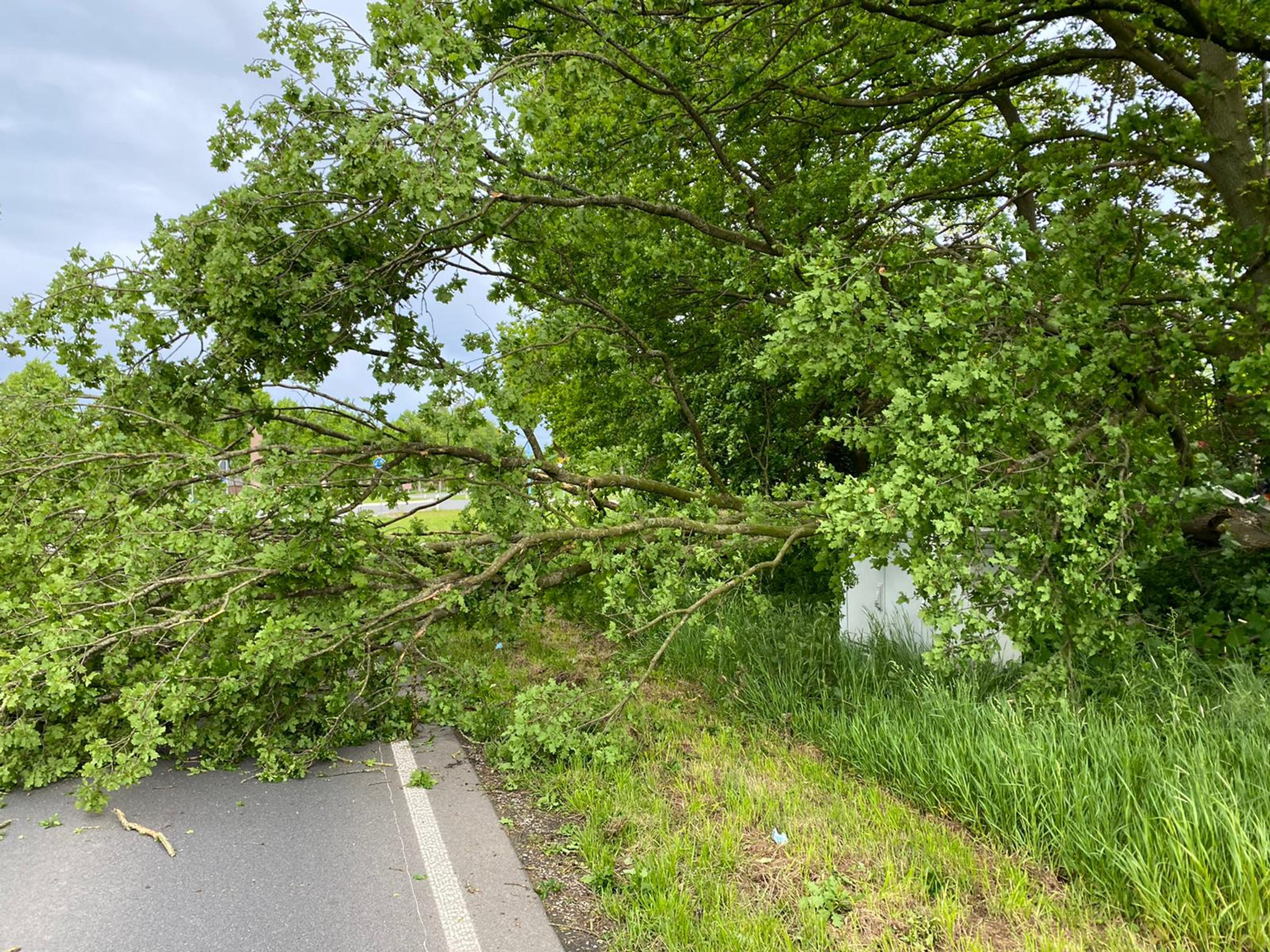 50 m hinter Kreisverkehr Schloss Moyland in Fahrtrichtung Kalkar war auf der linken Seite ein dreifach gegabelter Baum auseinander gebrochen. Der abgebrochene Teilstamm bedeckte die Fahrbahn der B57 nahezu vollständig. Der Baum wurde in handliche Teile zersägt und in der Bankett abgelegt. Anschließend wurde die Fahrbahn gereinigt und die Einsatzstelle der Polizei übergeben. Während der Beseitigung war die B57 für etwa 30 min. voll gesperrt.