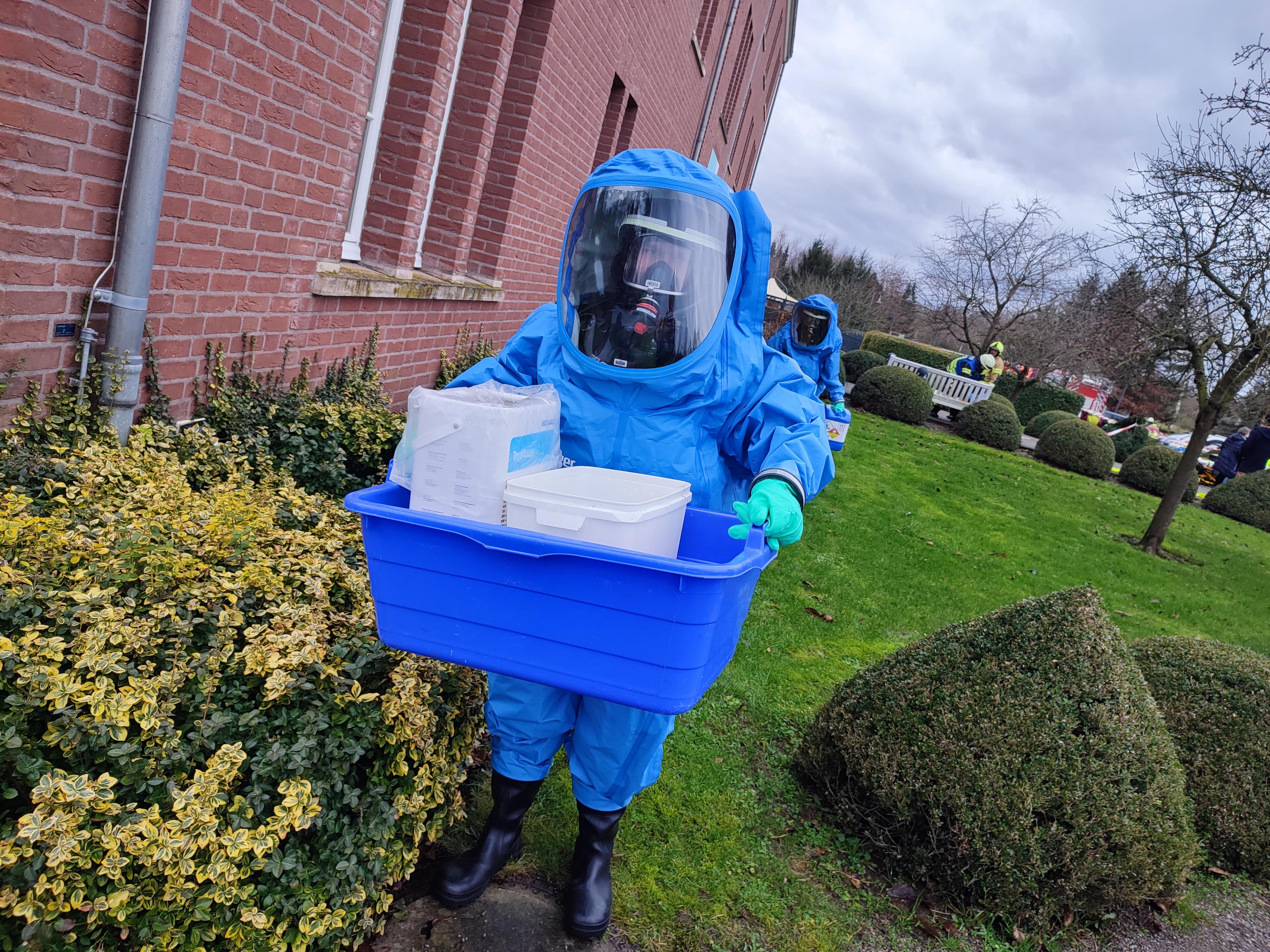 Durch die Einsatzkräfte wurde unter schwerem Atemschutz der Gefahrenbereich erkundet. Danach wurde entschieden, Bewohner:innen der Pflegeeinrichtung aus Sicherheitsgründen in nicht betroffene Gebäudeteile zu evakuieren. Anschließend nahm ein Angriffstrupp in Chemieschutzanzügen und Atemschutz umfangreiche Messungen der Umgebungsluft im Keller und im Gebäude vor. Danach wurde der geöffnete Kanister verschlossen, das ausgelaufene Reinigungsmittel aufgenommen und kontaminierte Gegenstände ins Freie gebracht.