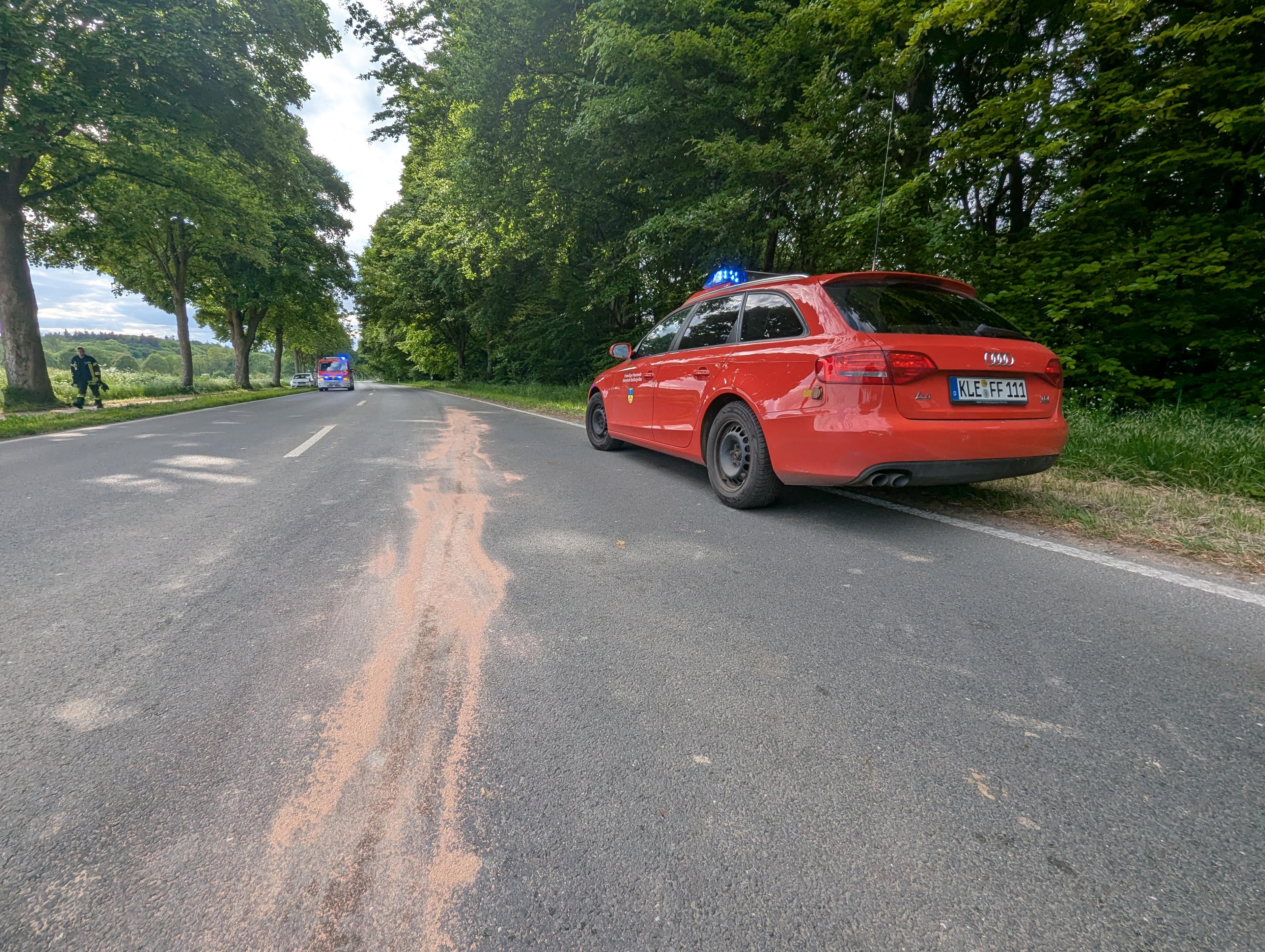 Ölspur vermutlich durch einen Traktor. Beginnend auf der Kalkarer Straße (B57) durch den Kreisverkehr Moyländer Allee in Richtung Till. Wurde durch uns abgestreut und Warnschilder aufgestellt.