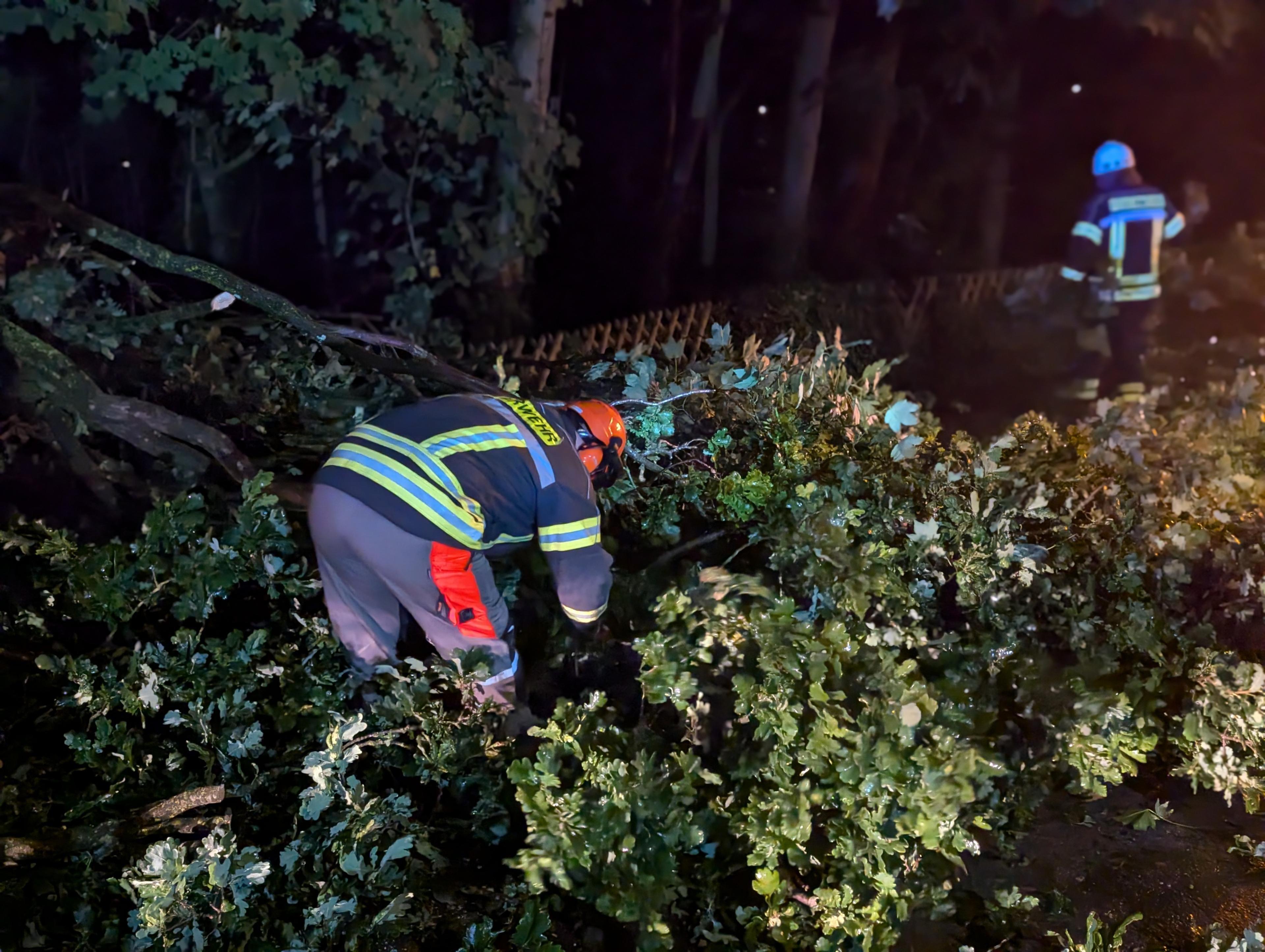 Ein großer Ast war abgebrochen und auf den Radweg/ Fahrbahn gefallen. Er wurde mit einer Kettensäge zerteilt und beseitigt. Zur Unterstützung wurde die Drehleiter nachgeforder.