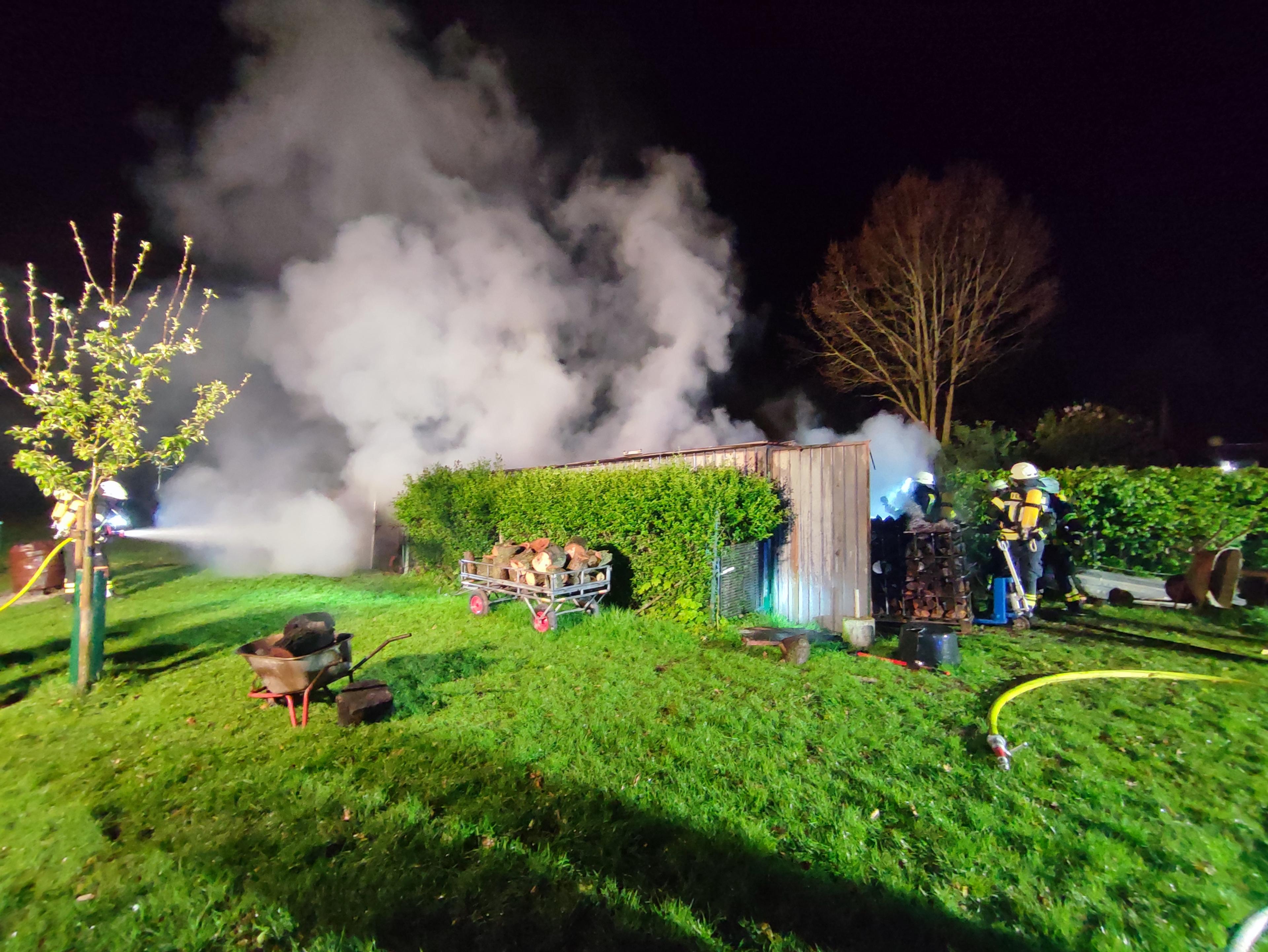 Beim Eintreffen der Einsatzkräfte stand eine Garage aus Metall und ein angrenzender Container in Vollbrand. Eingelagert waren dort u.a. Brennholz, ein Motorroller und ein Aufsitzrasenmäher.