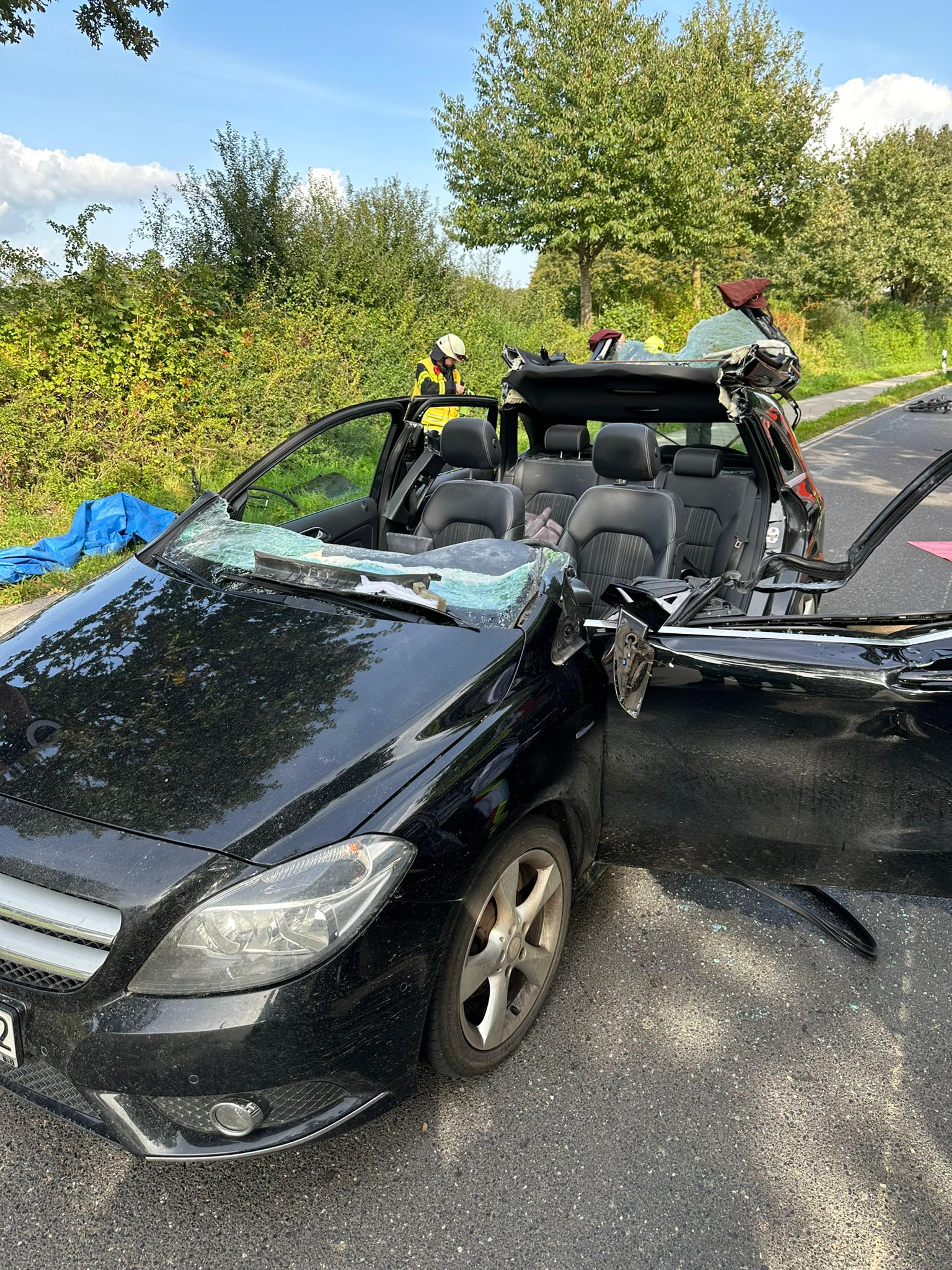 Zur patientenorientierten Rettung wurde auf Wunsch des Rettungsdienstes mit dem hydraulischen Rettungssatz das Dach abgenommen und eine große Seitenöffnung geschaffen, über die der nicht eingeklemmte Fahrer dann aus dem Auto gerettet werden konnte.