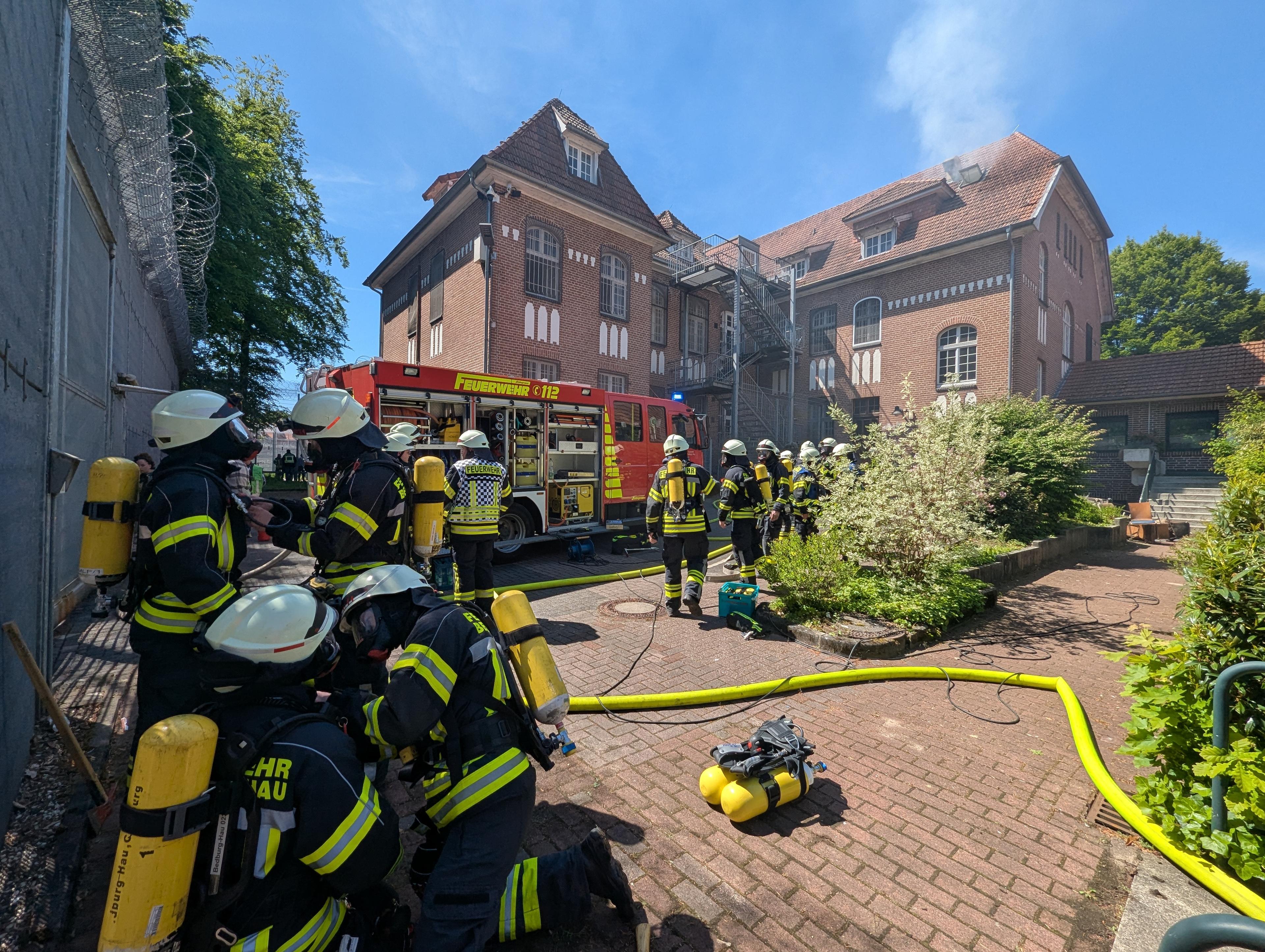 Die Feuerwehr wurde gegen 11 Uhr durch die automatische Brandmeldeanlage alarmiert. Beim Eintreffen wurde starke Rauchentwicklung festgestellt, die aus einem Dachfenster drang. Ein erster Löschangriff wurde zunächst unterbrochen, da nicht klar war, ob sich noch Personen im Gebäude befanden oder zurückkehren könnten. Nachdem die Lage gesichert war, wurde der Einsatz durch die Freiwillige Feuerwehr fortgesetzt.