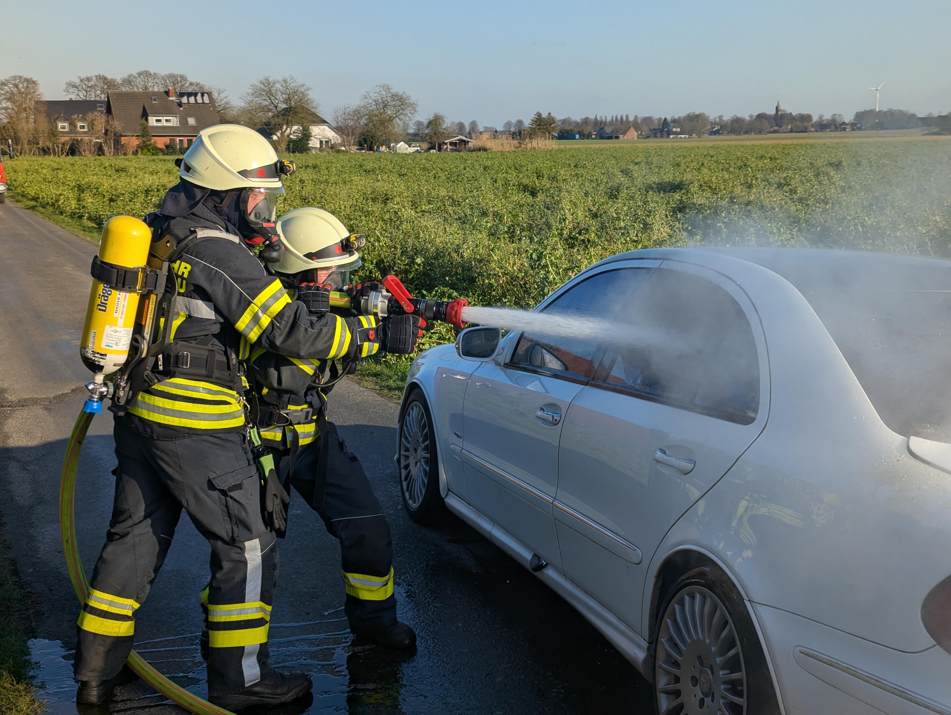 Beim Eintreffen der Feuerwehr drang eine starke Rauchentwicklung aus dem Inneren des Mercedes. Zwei Einsatzkräfte unter Atemschutz gingen sofort mit einer sogenannten C-Angriffsleitung zur Brandbekämpfung vor. Dazu musste im Verlauf auch der Kofferraum gewaltsam geöffnet werden, um letzte Glutnester abzulöschen.