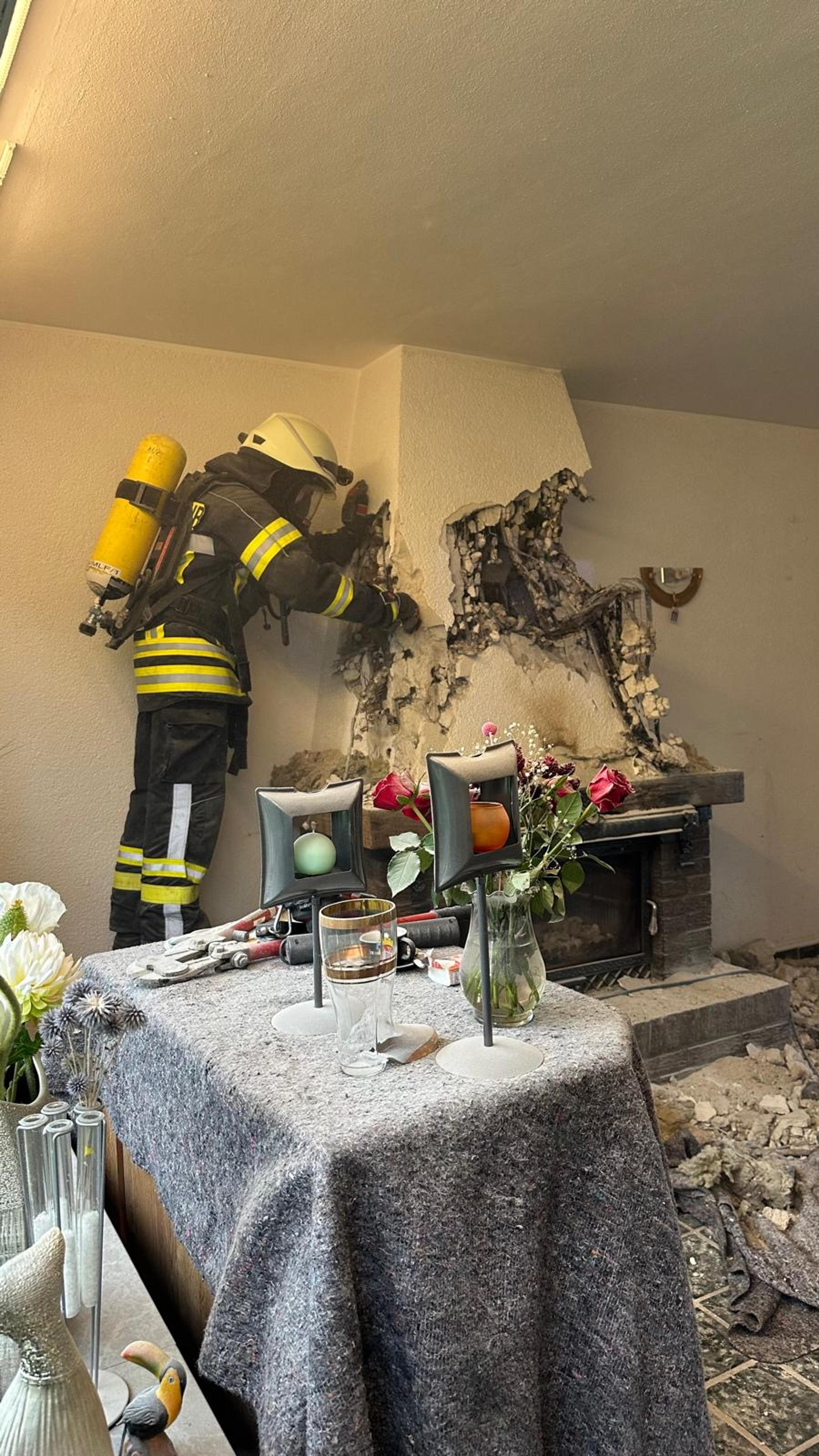Die Aussenverkleidung der Kaminkonstruktion wurde unter Atemschutz und mit schwerem Gerät geöffnet, um eine Brandausbreitung zu verhindern.