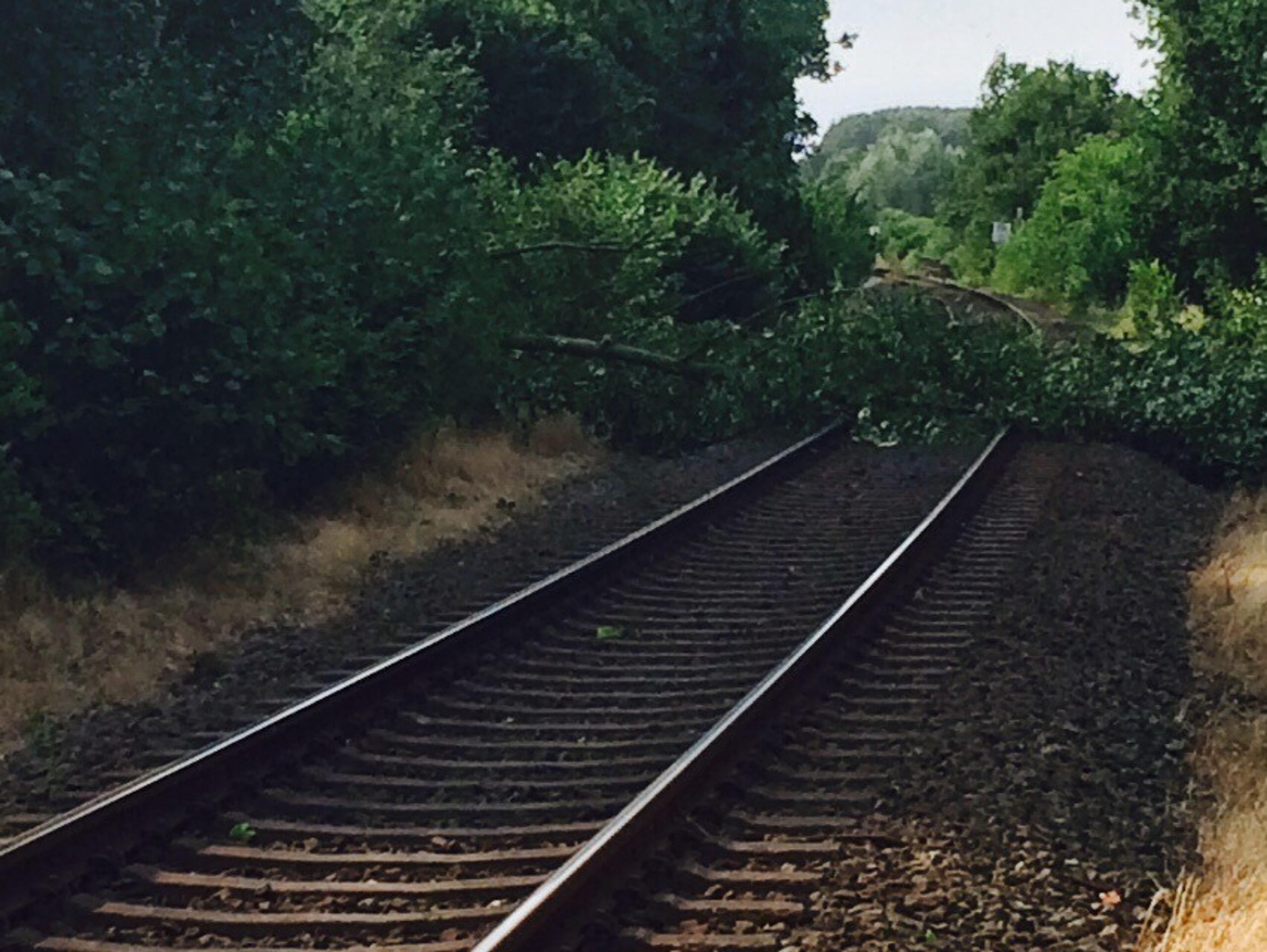 Ein umgestürzter Baum in Höhe des Bahnübergangs Hauer Straße sorgte gegen 17:30 Uhr auf der Bahnstrecke des RE 10 zwischen Goch und Kleve zu einer Streckensperrung. Kurzzeitige Sturmböen am frühen Abend waren der Auslöser.