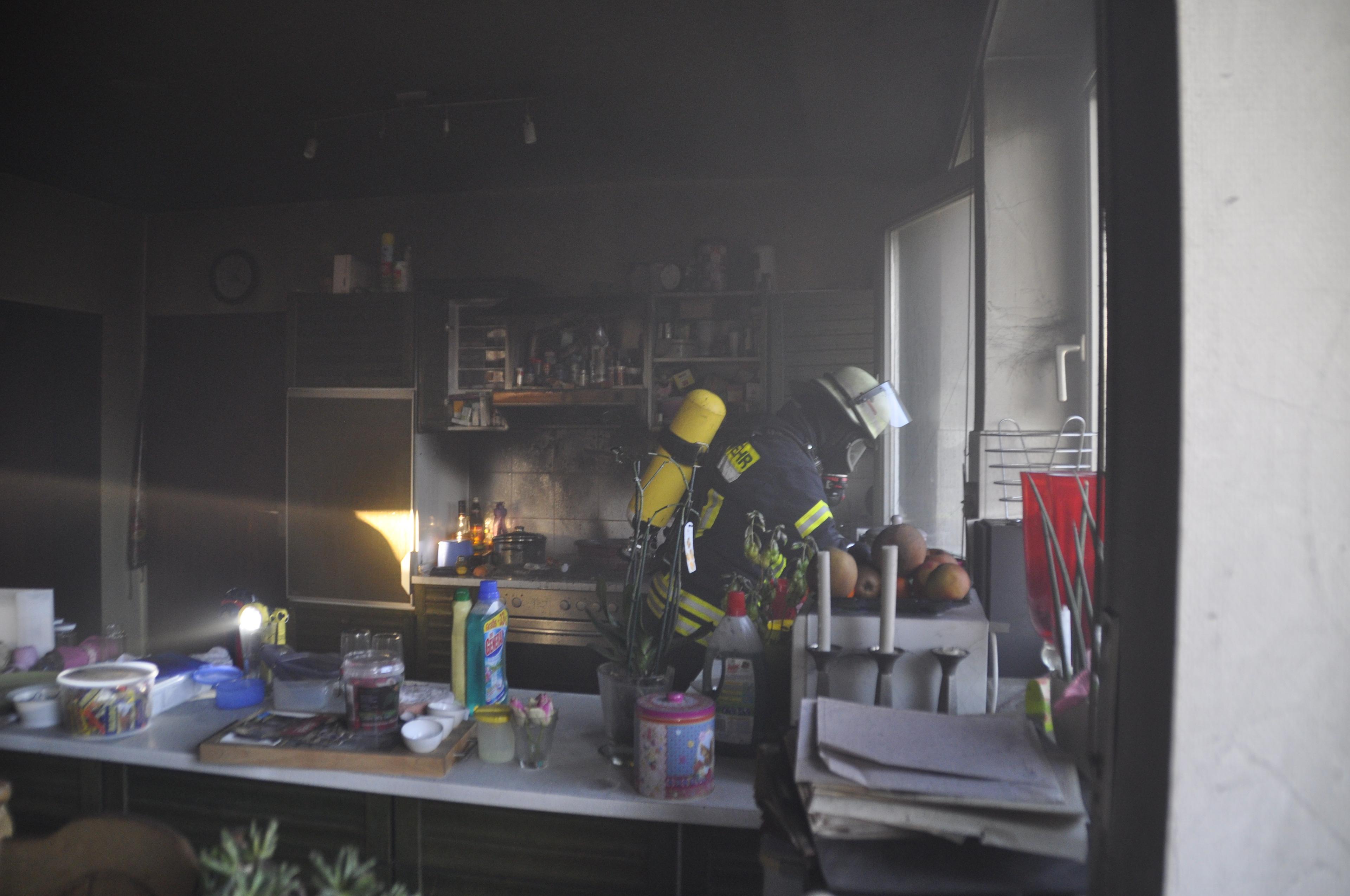 Das Feuer in der Küche hatte sich vom Herd auf die Dunstabzugshaube ausgebreitet. Als die Hauseigentümerin den Brand bemerkte, quoll schon dicker, schwarzer Rauch aus der Küche.