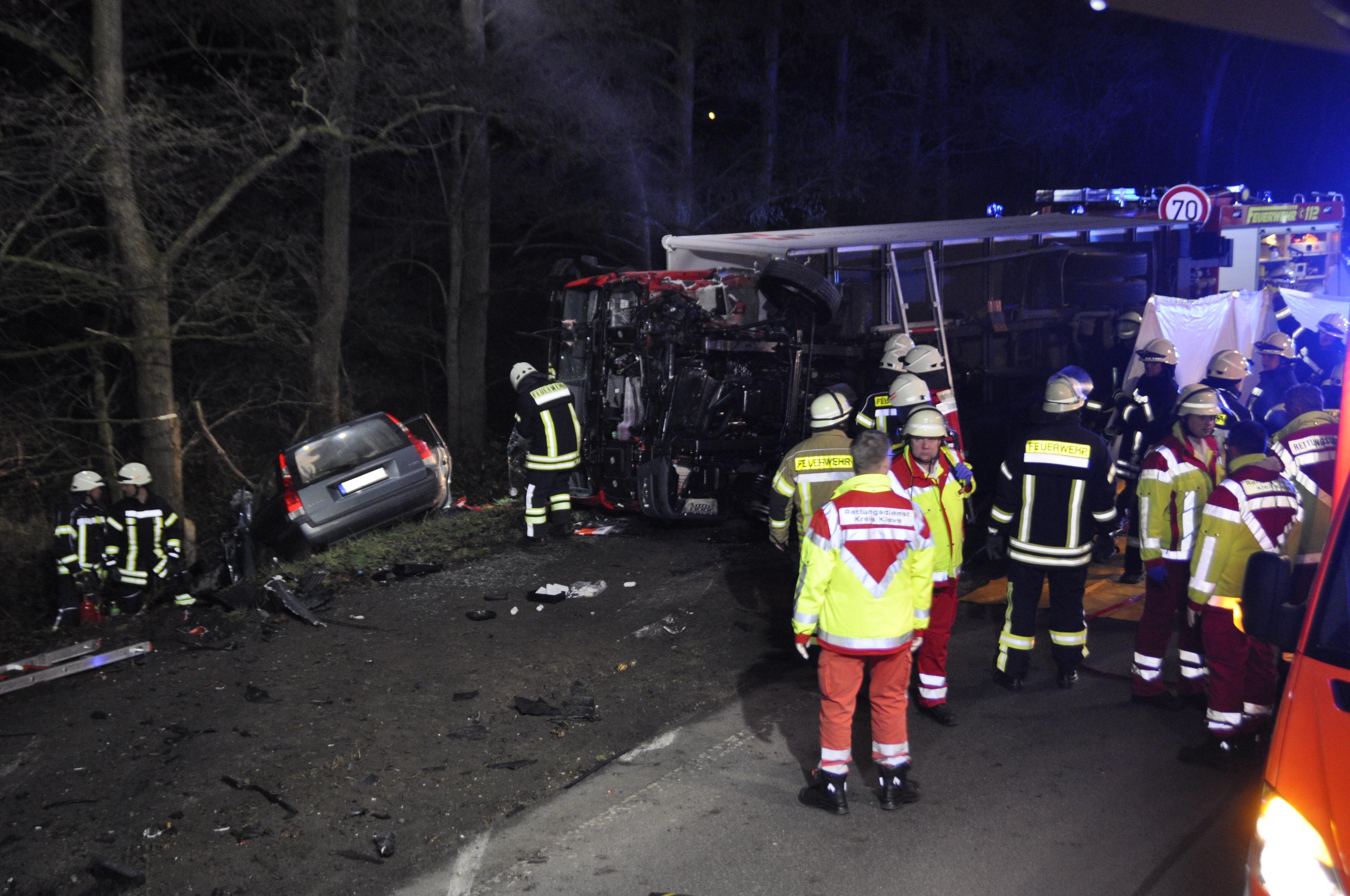 Vor dem Ortsteil Hasselt kam dein LKW-Fahrer aus bislang ungeklärter Ursache auf die Gegenfahrbahn und kollidierte dort frontal mit dem Volvo einer 63-jährigen Fahrerin aus Bedburg-Hau, die die Kalkarer Straße aus Richtung Hasselt in Richtung Kalkar befuhr. Die PKW-Fahrerin verstarb an der Unfallstelle. Durch die Wucht des Aufpralls kippte der LKW auf die Seite und blieb auf der Gegenfahrbahn liegen. Der Volvo schleuderte in einen Straßengraben.