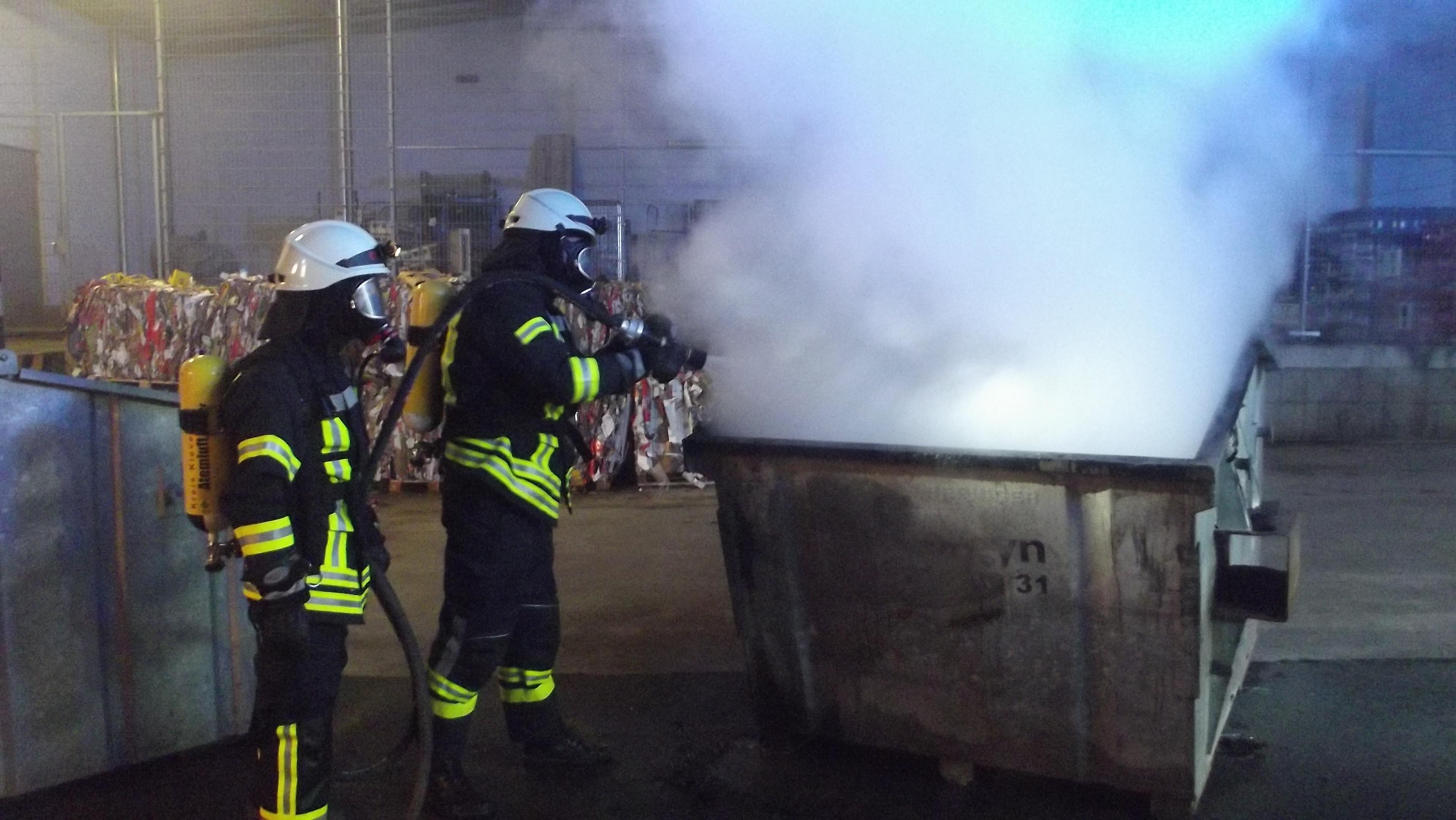 Beim Eintreffen der Einsatzkräfte brannte der Großraumcontainer bereits vollständig. Unter schwerem Atemschutz und zwei Schnellangriffeinrichtungen konnte das Feuer schnell gelöscht werden.