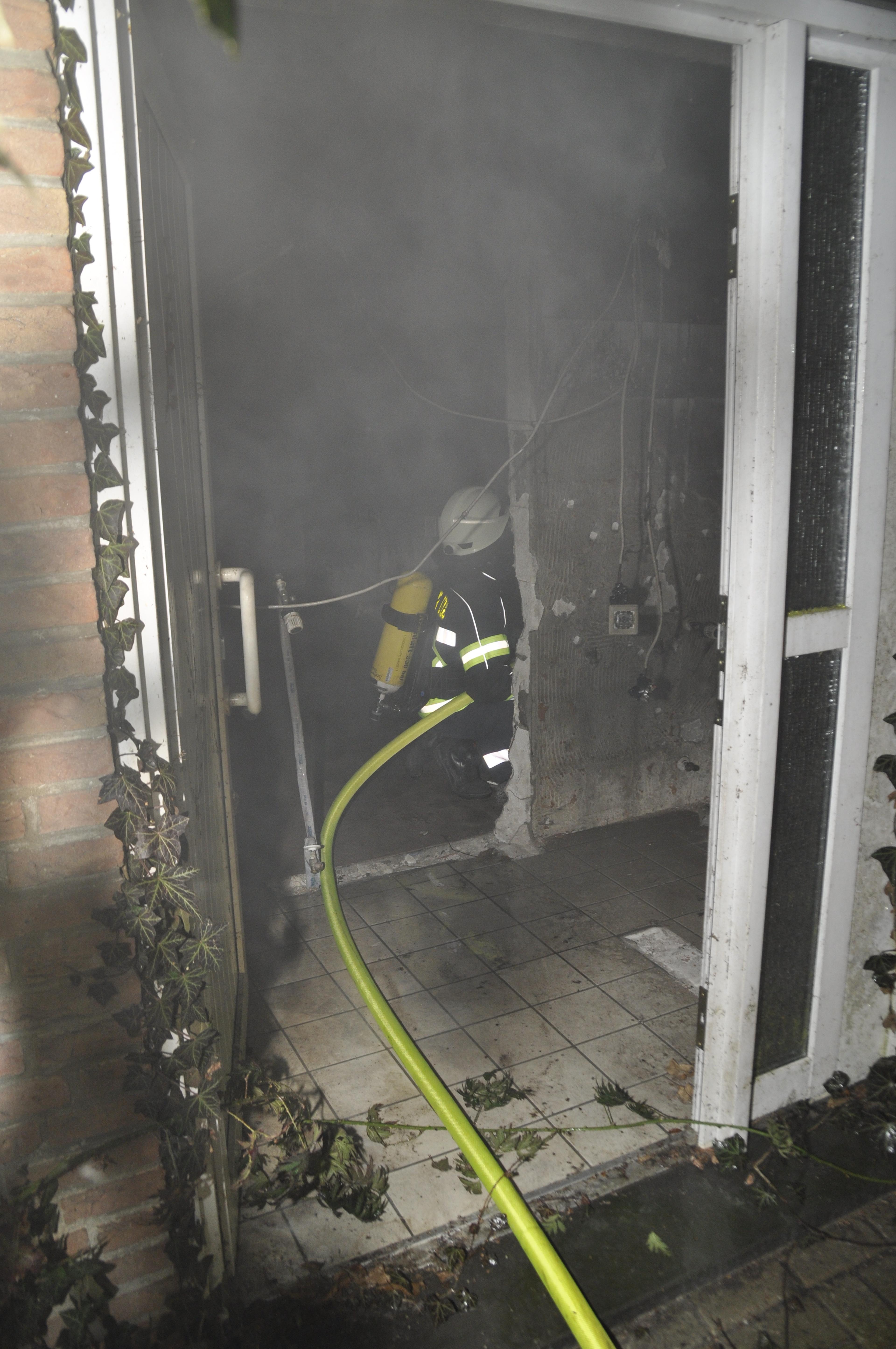 Um 01:04 Uhr wird die Freiwillige Feuerwehr Bedburg-Hau alarmiert. Die Anfahrt ist kurz. Die ersten Feuerwehrmänner die an ihren Fahrzeugen eintreffen, stehen selber im Brandrauch. Das brennende Gebäude ist ein Anbau ihres Gerätehauses an der Kalkarer Straße. Zunächst gilt es den Brand im ehemaligen Garten zu bekämpfen. Hier brannten ein Holzschrank und ein Bürostuhl. Der Gebäudebrand selber ist schnell unter Kontrolle. Die Feuerwehrmänner löschen von außen. Auch ist ein Angriffstrupp unter Atemschutz im Gebäude. Sie löschen mit einem C-Rohr das Feuer. Hier brannten ein Sessel, Holz- und Papierreste, aber auch ein Rasenmäher. Mit einem Hochleistungslüfter wird das Gebäude vom Brandrauch befreit.