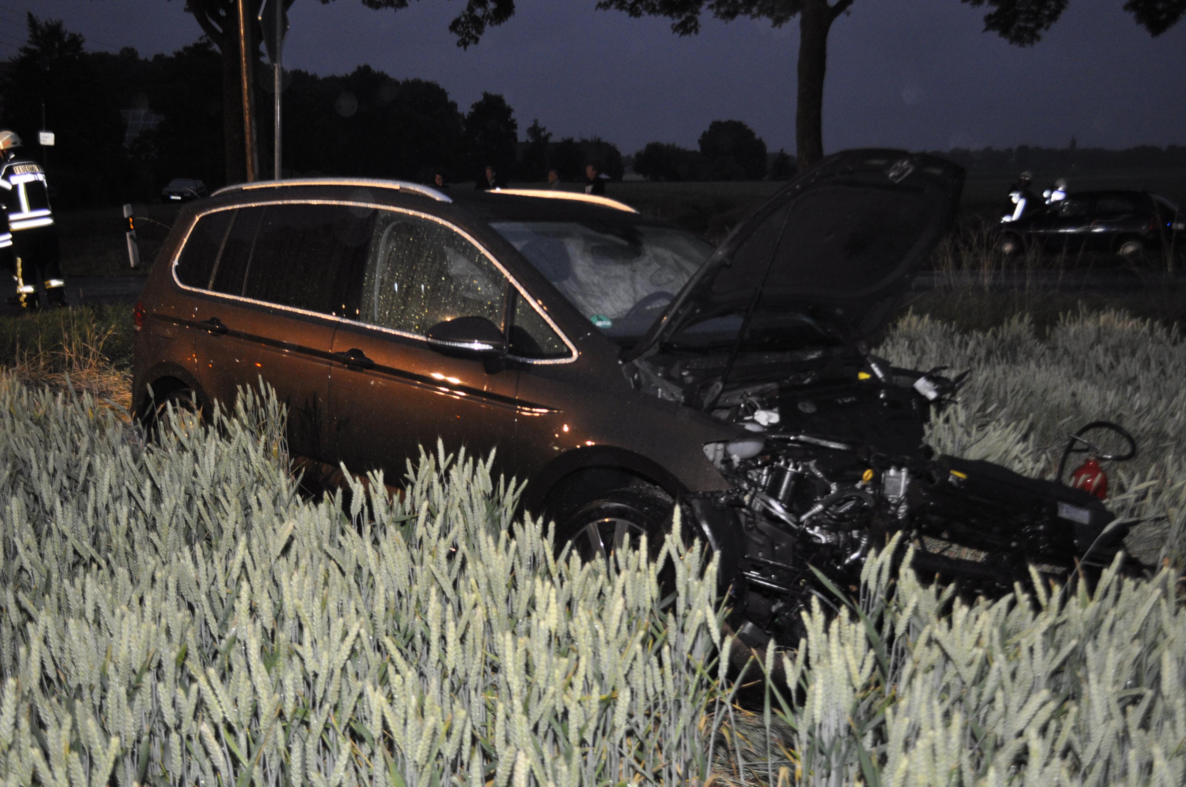 Gegen 22.00 Uhr kam es auf der Uedemer Straße im Kreuzungsbereich Imigstraße in Louisendorf zu einem schweren Verkehrsunfall. Ein Fahrzeugführer eines Opel Corsa der die Uedemer Straße von Kleve kommend befuhr, stieß mit einem VW Touran einer Fahrzeugführerin die von der Imigstraße auf die Uedemer Straße fahren wollte, zusammen. Dabei wurde der Corsa über die Gegenfahrbahn auf den Radweg und der VW Touran in ein angrenzendes Kornfeld geschleudert. An beiden Fahrzeugen entstand erheblicher Sachschaden. Verletzt wurden die Unfallbeteiligten nicht. Durch die Einsatzkräfte der Feuerwehr wurden die Unfallstelle und die Fahrzeuge gesichert. Auslaufende Betriebsstoffe wurden aufgenommen und Fahrzeugteile von der Straße geräumt. Die Einsatzstelle wurde ausgeleuchtet, der Brandschutz sichergestellt. Hier waren 15 Einsatzkräfte der Freiwilligen Feuerwehr Bedburg-Hau etwa eine Stunde beschäftigt.