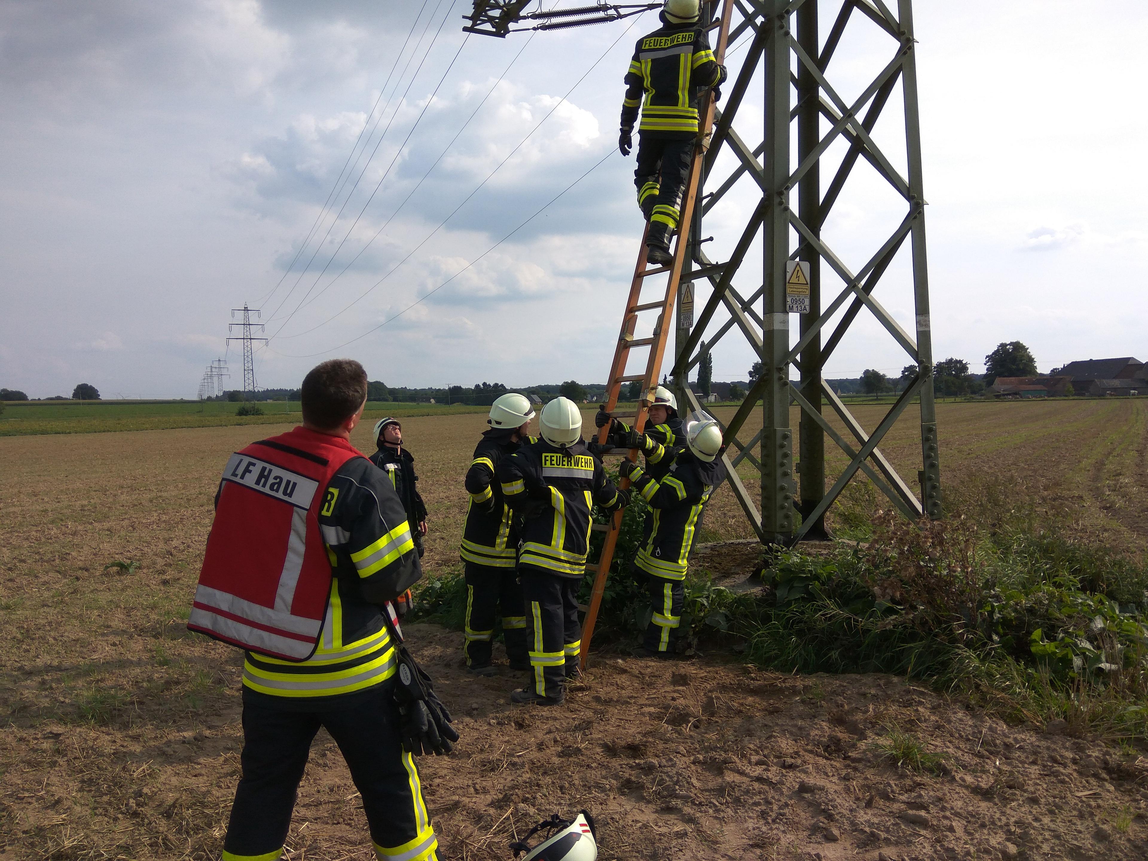 Zu einer hilflosen Person auf einem Strommast wurde heute (21.08.2017) um 16:22 Uhr die Freiwillige Feuerwehr Bedburg-Hau auf eine Freifläche am Johann-van-Aken-Ring alarmiert.