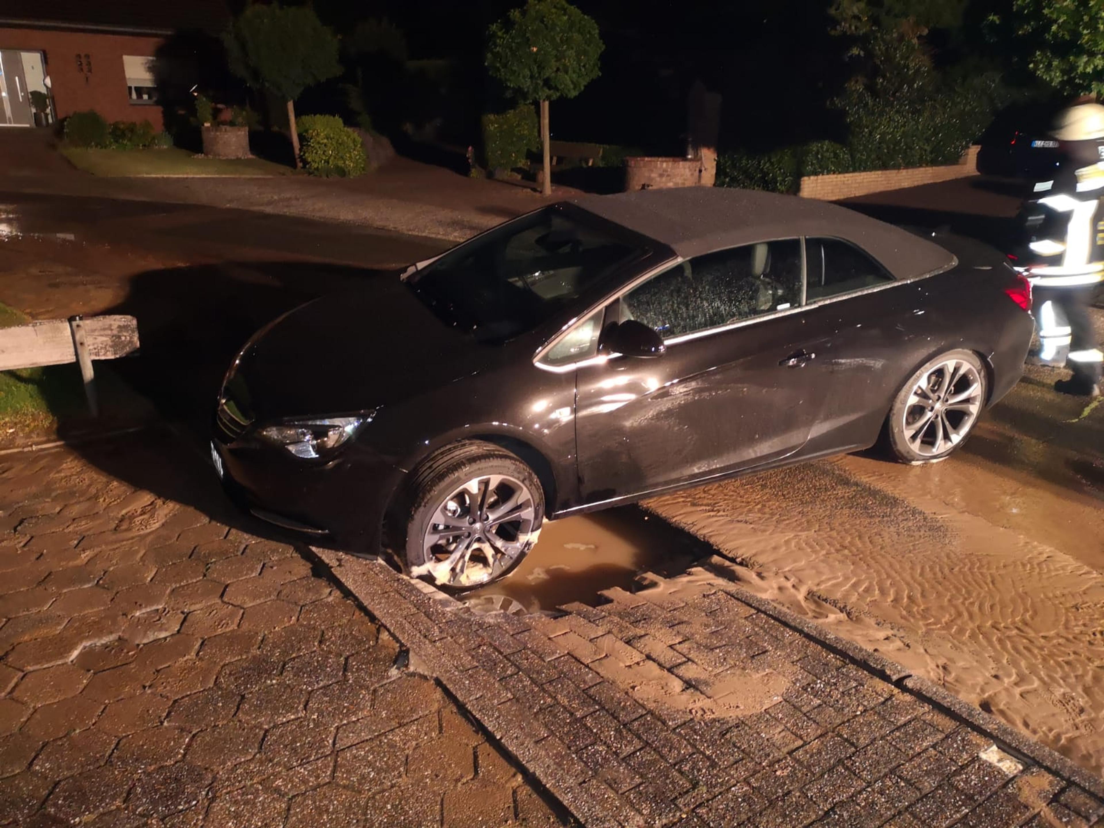 Alarmiert wurde die Freiwillige Feuerwehr Bedburg-Hau um 03:06 Uhr. Anwohner hatten zuvor die Polizei informiert. Wie es zu dem Rohrbruch kam ist unbekannt. Als direkte Folge wurde der Gehweg so unterspült, dass ein PKW eines Anwohners einbrach. Er wurde später mit dem Kran eines Abschleppfahrzeugs herausgehoben. Zuvor mussten die Einsatzkräfte das geborstene Rohr abschiebern. Danach wurde kontrolliert, ob Wasser in die anliegenden Keller eingelaufen war. Hier gab es keine Schäden. Allerdings weiter entfernt auf der Sommerlandstraße. Durch den hohen Wasserdruck lief hier ein Keller unter Wasser. Der Hauseigentümer konnte sich aber selber helfen.