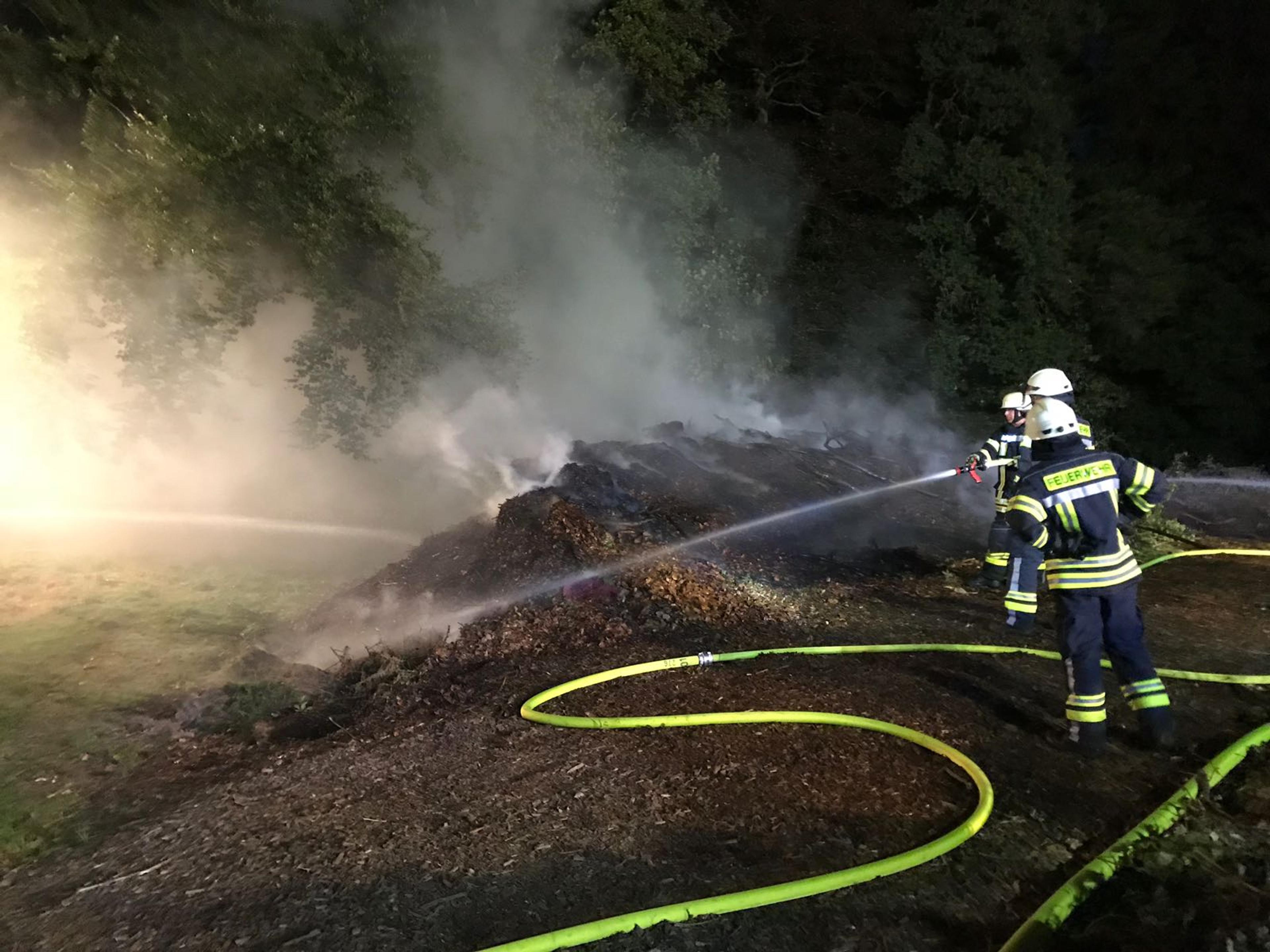 Die Einsatzdauer betrug fast zwei Stunden, da mit großem Wassereinsatz letzte Glutnester abgelöscht werden mussten, um eine erneute Brandausbereitung zu verhindern. Auch kam ein Radlader zum Einsatz.