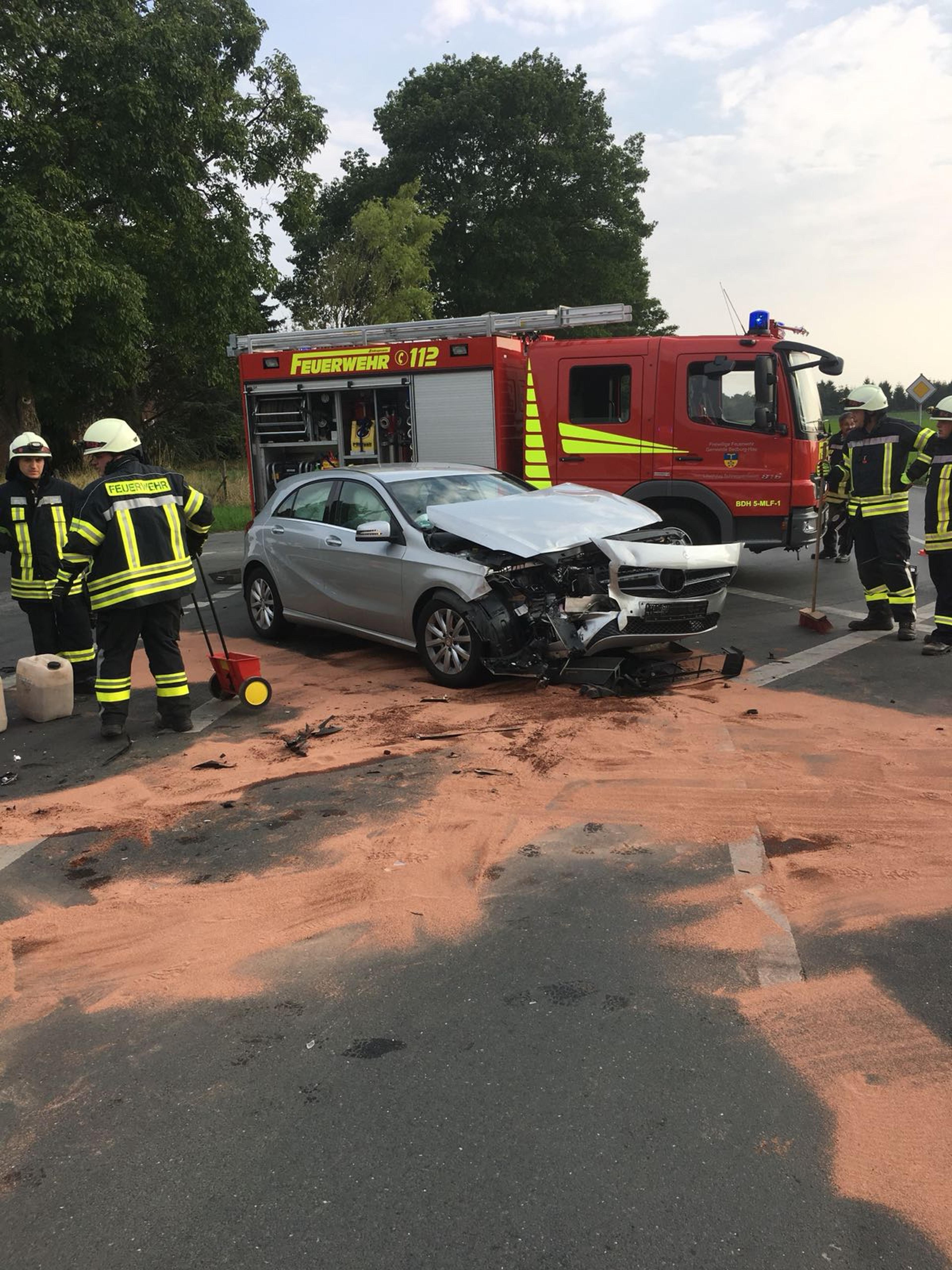 Bei einem Zusammenstoß zweier Fahrzeuge im Kreuzungsbereich Uedemer Straße und Johann-van-Aken-Ring wurden zwei Personen leicht verletzt. Durch die Feuerwehr wurde die Unfallstelle gesichert und auslaufende Betriebsstoffe aufgenommen.