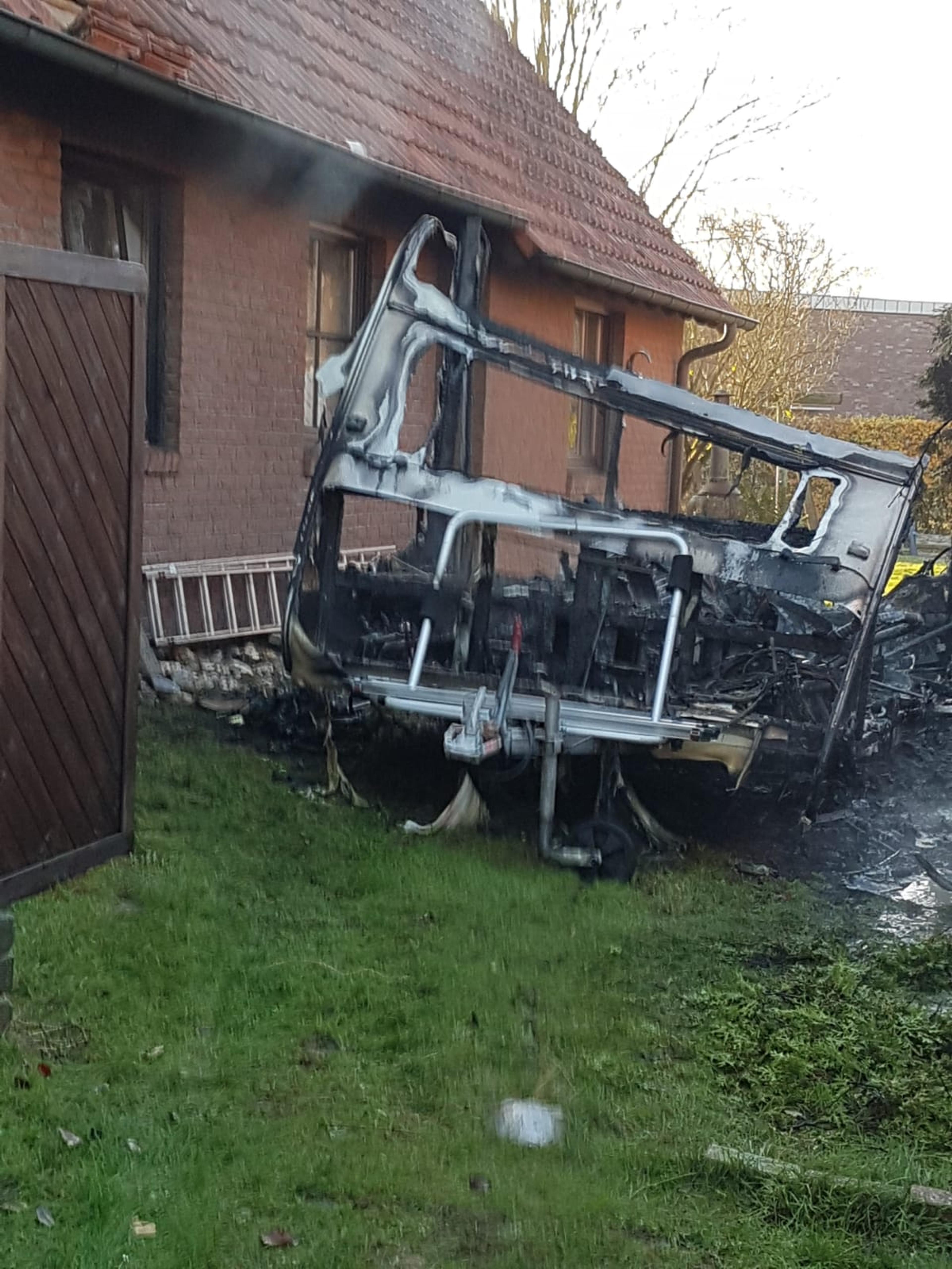 Ausgelöst durch Abflämmen von Unkraut mit einem Gasbrenner kam es heute (15.11.2018) zu einer unklaren Rauchentwicklung an der Lindenstraße in Hau. Aus Unachtsamkeit war dabei das Feuer auf eine Tujahecke übergeschlagen. Dadurch geriet auch ein in unmittelbarer Nähe abgestellter Wohnwagen in Brand. Er wurde vollständig zerstört. Durch die starke Rauch- und Hitzeentwicklung wurden auch Teile des Nachbarhauses beschädigt. Hier kam zu einem Zimmerbrand und Beschädigungen an der Fassade, Türen und Fenstern.