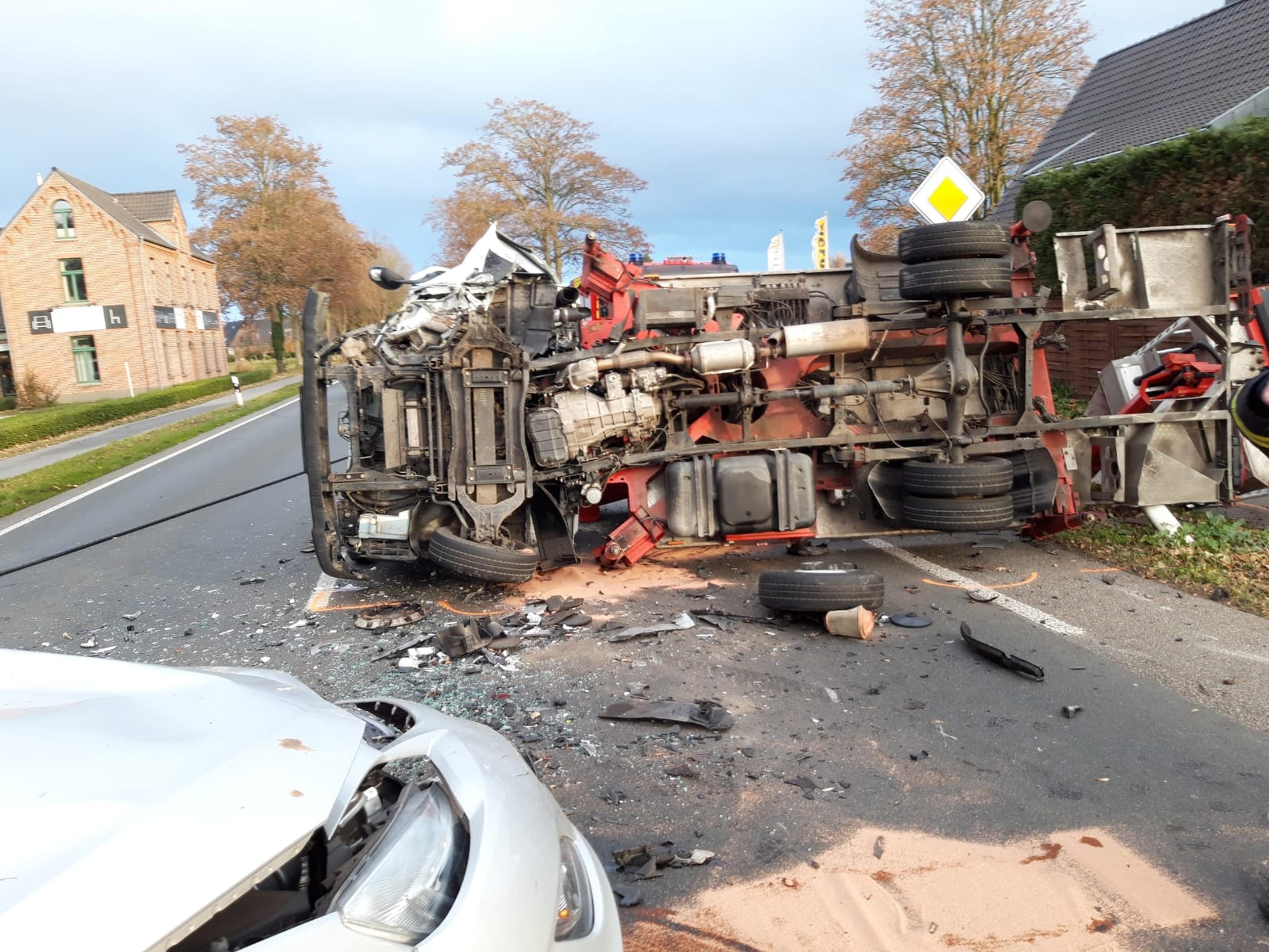 Am Montag (19. November 2018) gegen 8.30 Uhr fuhr ein 46-jähriger Mann aus Bedburg-Hau in einem Opel Astra auf der Gocher Landstraße (Bundesstraße 9) von Kleve in Richtung Goch. Der 46-Jährige wollte nach links in den Hauer Grenzweg abbiegen und hielt aufgrund des Gegenverkehrs an. Er wartete am linken Rand seiner Fahrspur und ein Kleintransporter fuhr bereits rechts an ihm vorbei. Ein 86-jähriger Mann aus Viersen war in einem Mercedes A-Klasse ebenfalls auf der B9 in Richtung Goch unterwegs. Er fuhr auf den Opel auf und schob ihn auf die Gegenfahrbahn. Dort stieß der Opel mit einem entgegenkommenden Kran-LKW der Marke Nissan zusammen, den ein 46-jähriger Mann aus Bedburg-Hau fuhr. Der Kran kippte bei dem Zusammenstoß auf die Seite. Die drei Fahrer verletzten sich bei dem Unfall leicht. Alle Fahrzeuge waren so stark beschädigt, dass sie abgeschleppt werden mussten. Die B9 war bis gegen 10.15 Uhr in beide Richtungen gesperrt. Polizeibeamte leiteten den Verkehr ab.