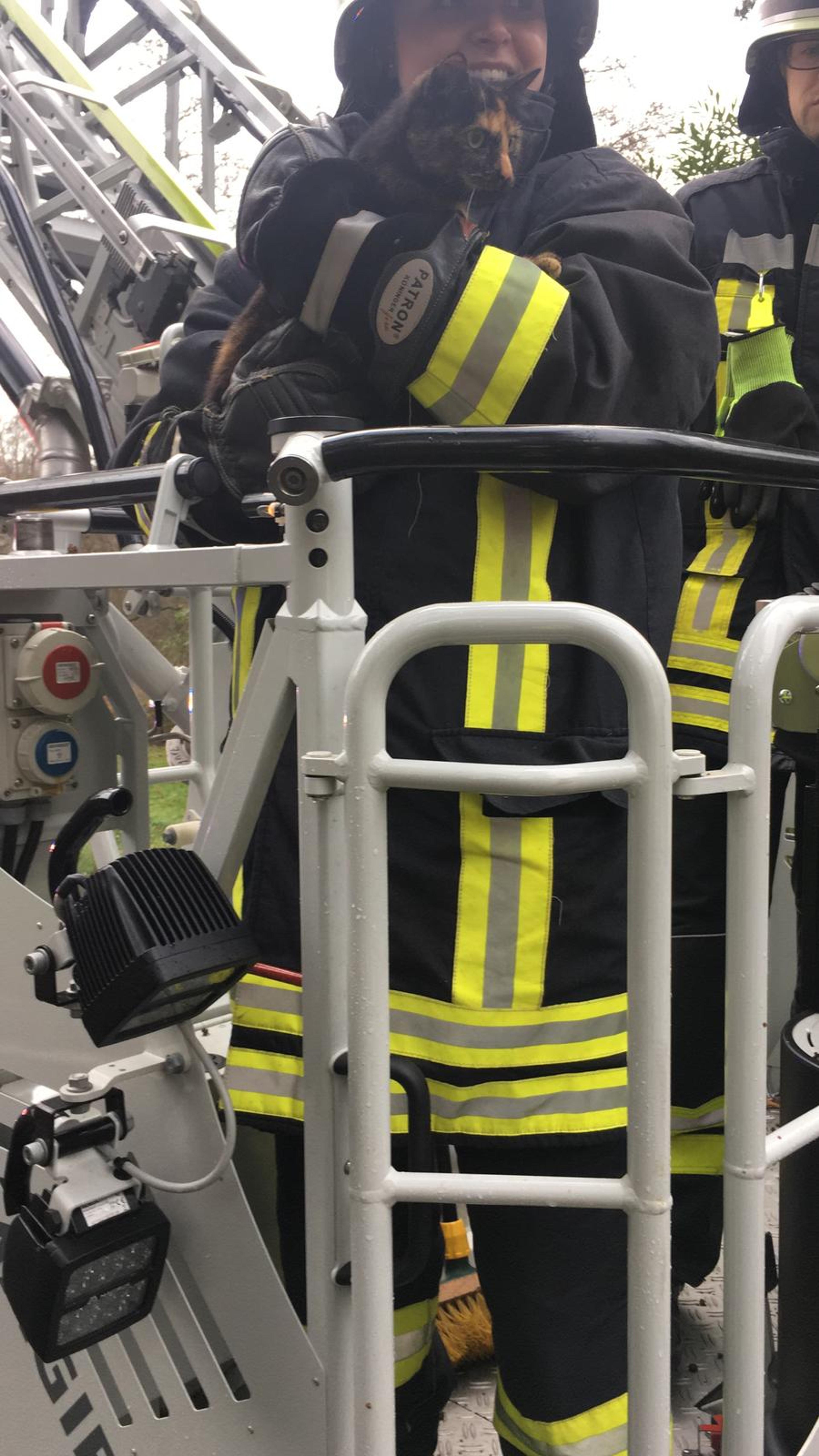 Die Einsatzkräfte rückten mit einem Löschfahrzeug und einer Drehleiter an. Freiwillig und ohne Gegenwehr ließ sich Gerry retten und wieder auf den Boden bringen. Natürlich zur Freude seiner besorgten Besitzer.