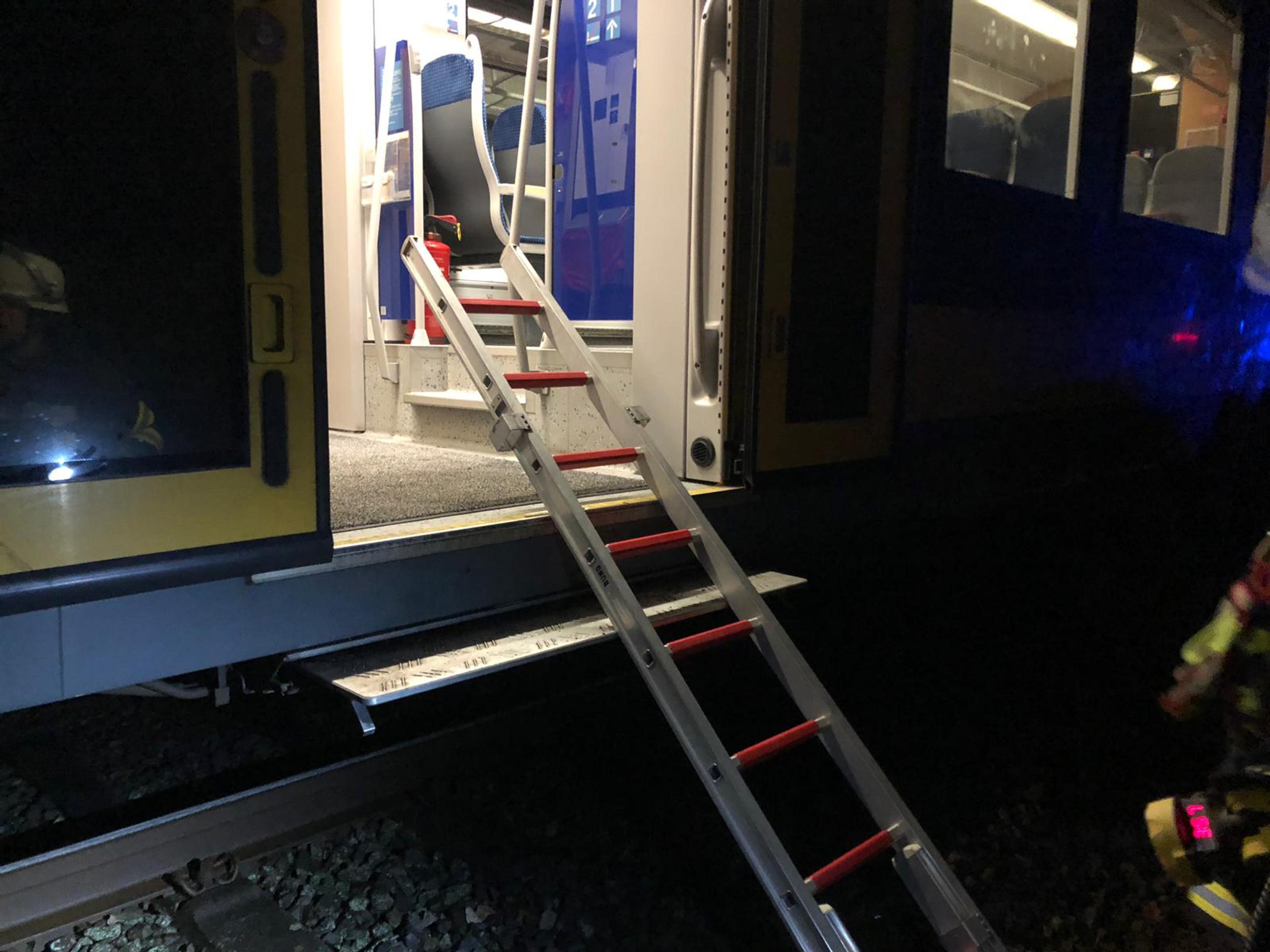 Personenschaden im Zugverkehr. Unfallstelle wurde ausgeleutet und Fahrgäste wurden mittels Steckleitern aus dem stehenden Zug herausgebracht. Auch wurde die Betreuung der Fahrgäste übernommen und die Hauer Straße in Absprache mit der Polizei abgesperrt.