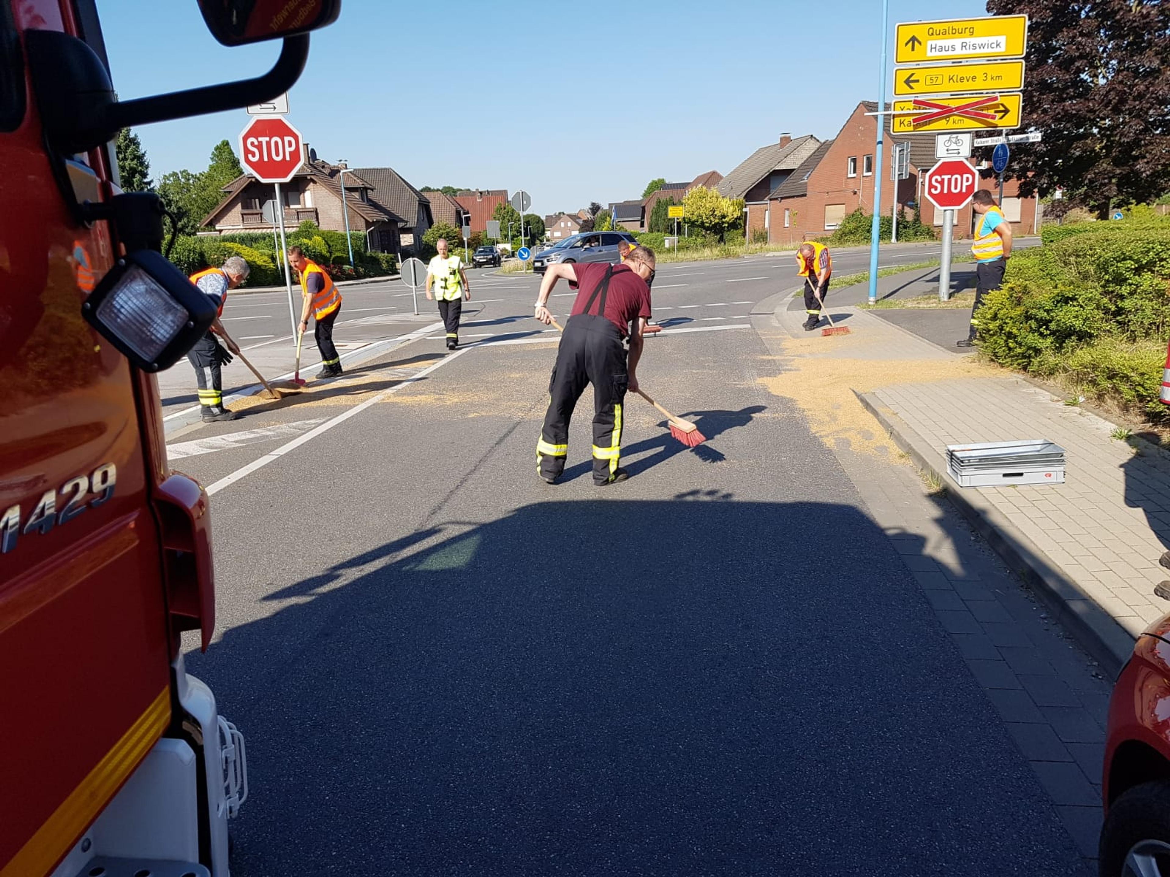 Für die Aufräum- und Reinigungsarbeiten wurde um 17:59 Uhr die Freiwillige Feuerwehr Bedburg-Hau alarmiert. Mit Schaufeln und Besen wurde der Weizen aufgenommen und entsorgt. Für die Zeit der Arbeiten war der Einmündungsbereich einseitig gesperrt.