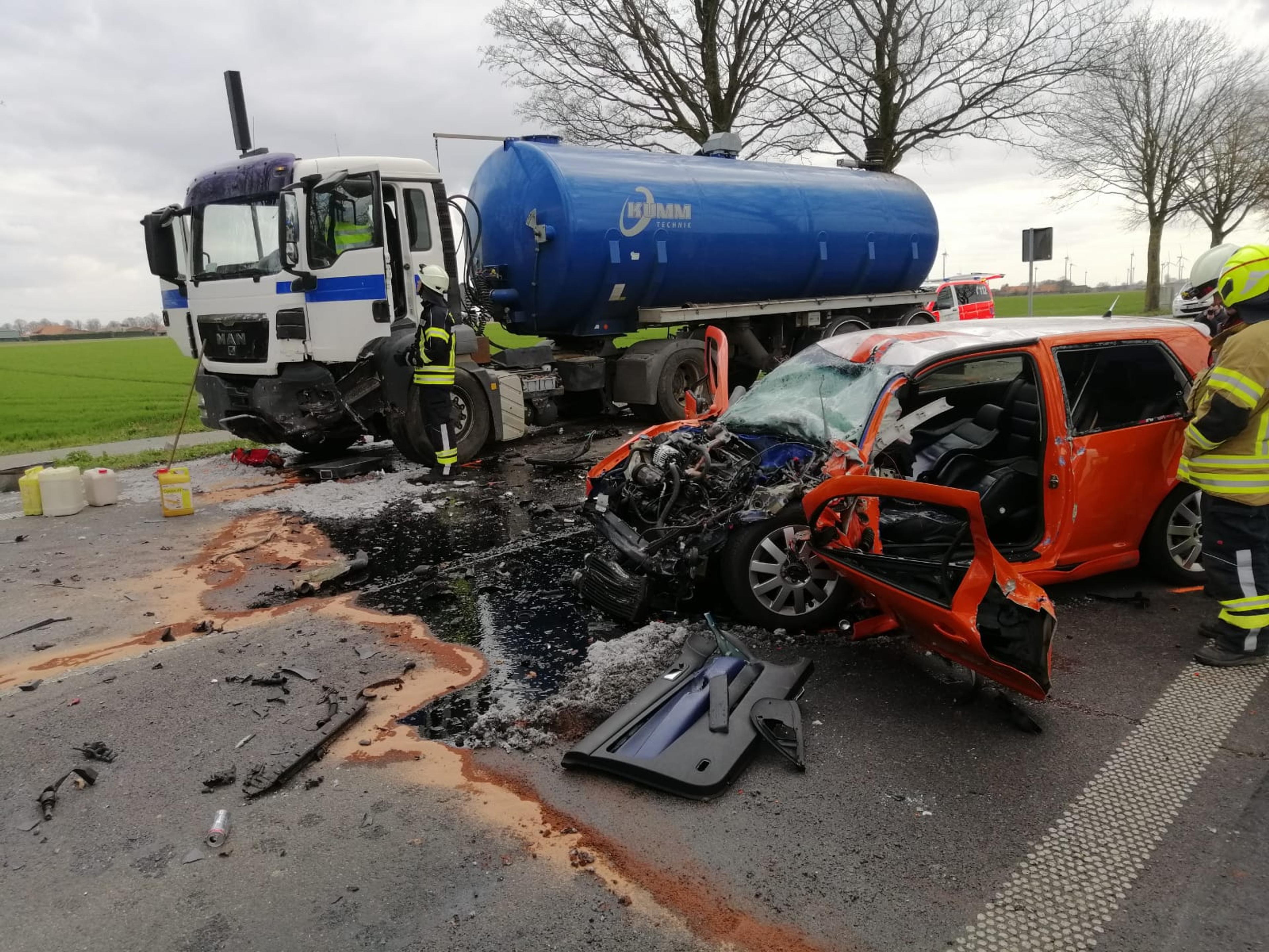 Zu einem tödlichen Verkehrsunfall kam es heute (03.04.2020) gegen 16:05 Uhr auf der Gocher Straße (B67) in Louisendorf. Ein 39jähriger Fahrer eines VW Golf hatte zuvor die Gocher Straße aus Kalkar kommend in Richtung Goch befahren. Im Bereich der Neulouisendorfer Straße war er aus bisher ungeklärter Ursache auf die Gegenfahrbahn geraten und dort frontal mit einem LKW zusammengeprallt. Für den Fahrer des Golf kam jede Hilfe zu spät, er konnte nur noch Tod aus seinem Fahrzeug geborgen werden. Der 68jährige Fahrer des LKW wurde verletzt und vom Rettungsdienst versorgt.