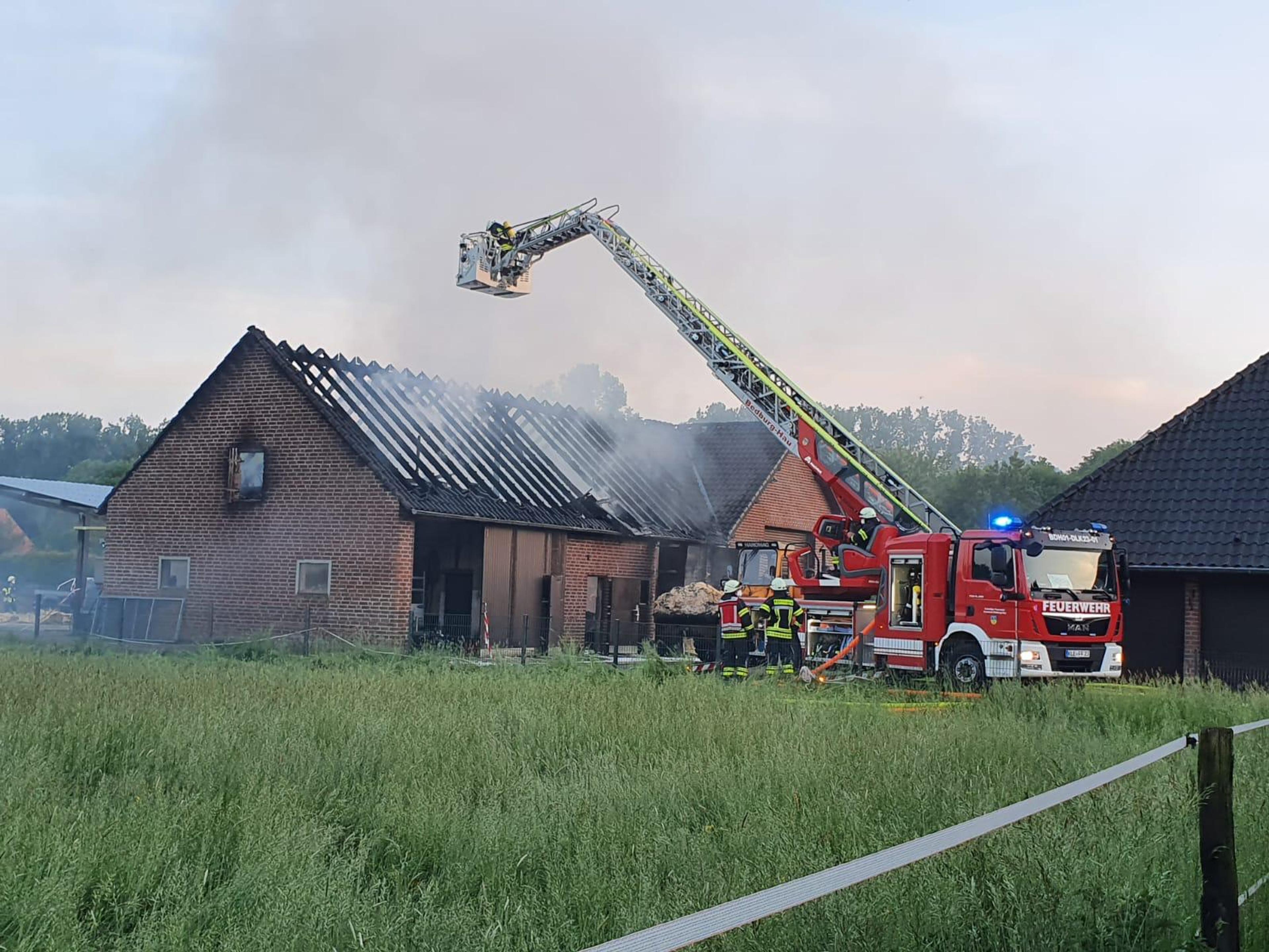 Alarmiert wurde die Freiwillige Feuerwehr Bedburg-Hau um 19:21 Uhr. Gemeinsam mit dem Eigentümer konnten die Einsatzkräfte mehrere Pferde und hochwertige Arbeitsmaschinen sowie Fahrzeuge aus der Scheune herausbringen, bevor sich ich das Feuer auf die gesamte Gebäude ausbreitete. Größere Mengen an Stroh- und Einstreuvorräten waren dort eingelagert. Umstehende Gebäude wurden mit einer Riegelstellung geschützt. Es konnte jedoch nicht verhindert werden, dass Teile einer angrenzenden Werkstatt beschädigt wurden.