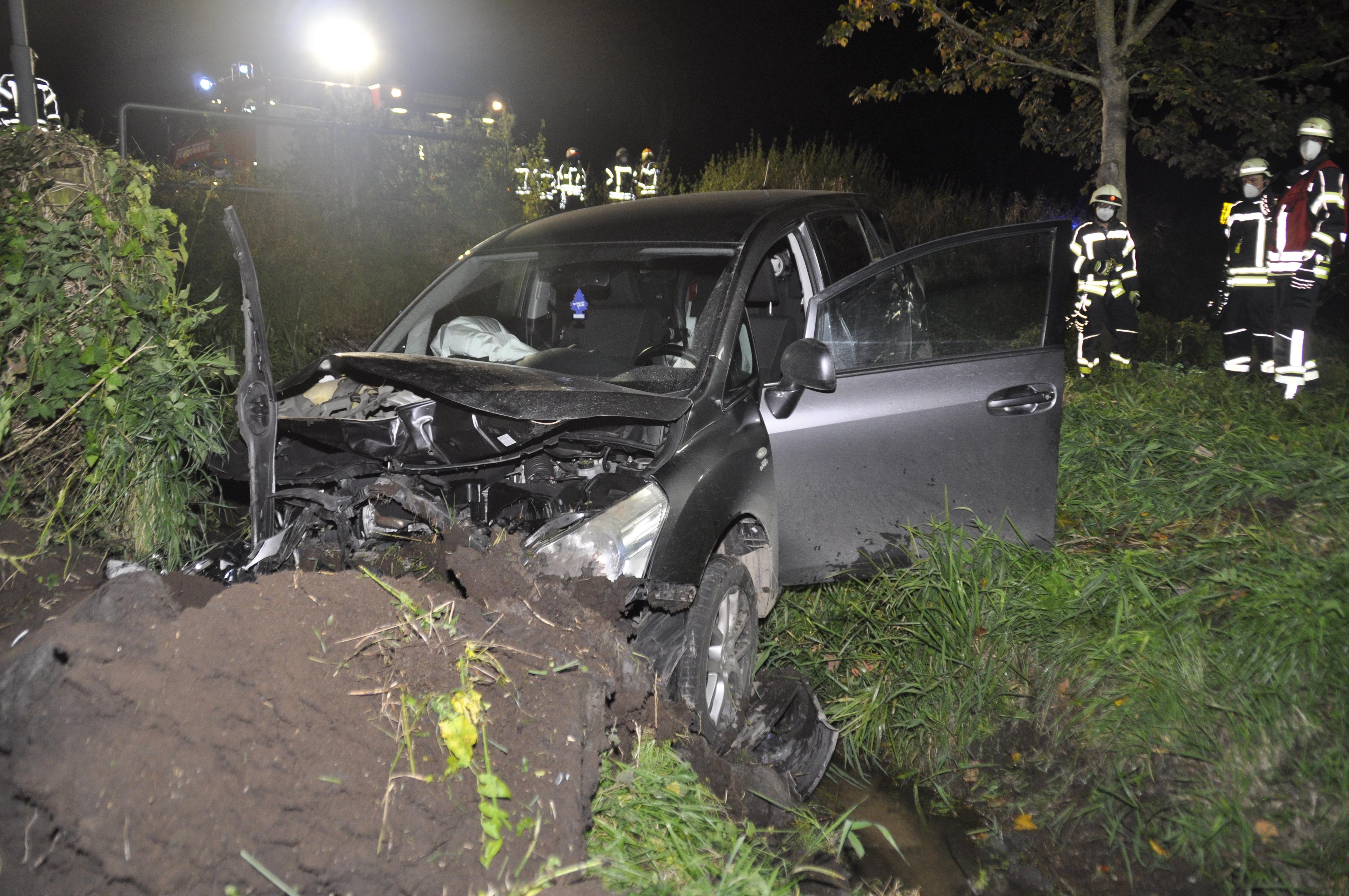 In Höhe einer Geschwindigkeitsmessanlage im Kreuzungsbereich Kalkarer Straße (B57)/ Berk'sche Straße war ein 41jähriger Fahrzeugführer aus Rees mit seinem PKW zunächst seitlich von der Straße abgekommen und dann unterhalb eines Abhangs in einen Wassergraben geprallt. Mit schweren Verletzungen konnte der Fahrer sich aus seinem Fahrzeug befreien und den Abhang hoch auf die Bundesstraße schleppen. Dort wurden vorbeifahrende Verkehrsteilnehmer auf ihn aufmerksam und alarmierten die Feuerwehr und den Rettungsdienst.
