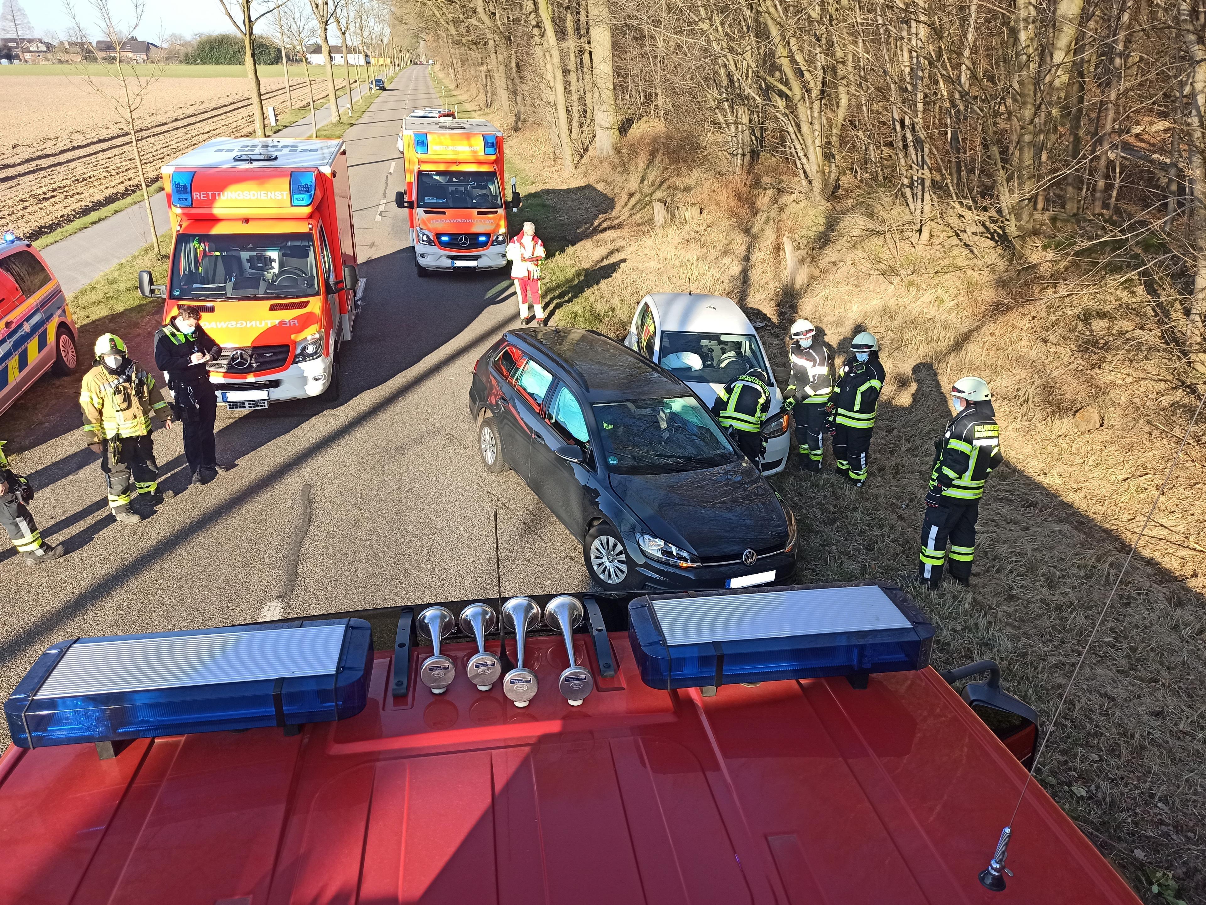 Zu einem Verkehrsunfall auf der Felix-Roeloffs-Straße wurde heute (09.03.2022) die Freiwillige Feuerwehr Bedburg-Hau und der Rettungsdienst des Kreises Kleve alarmiert. Aus unbekannter Ursache waren ein PKW Golf Kombi und ein Skodo Citigo zusammengeprallt. Beide Fahrzeuge kamen dann im Seitenstreifen zum Stehen. Um 08:36 Uhr wurde über das in einem Fahrzeug verbaute eCall-System die Feuerwehr und der Rettungsdienst mit dem Hinweis "Verkehrsunfall, eingeklemmte Person" alarmiert. Beide Fahrzeugführer wurden bei dem Zusammenprall nicht eingeklemmt, mussten jedoch vom Rettungsdienst versorgt werden. Die Kräfte der Feuerwehr sicherten das Fahrzeug und die Unfallstelle. Im Einsatz waren etwa 30 Einsatzkräfte der Freiwilligen Feuerwehr Bedburg-Hau sowie des Rettungsdienstes. Die Einsatzleitung hatte der Gemeindebrandinspektor Klaus Elsmann.