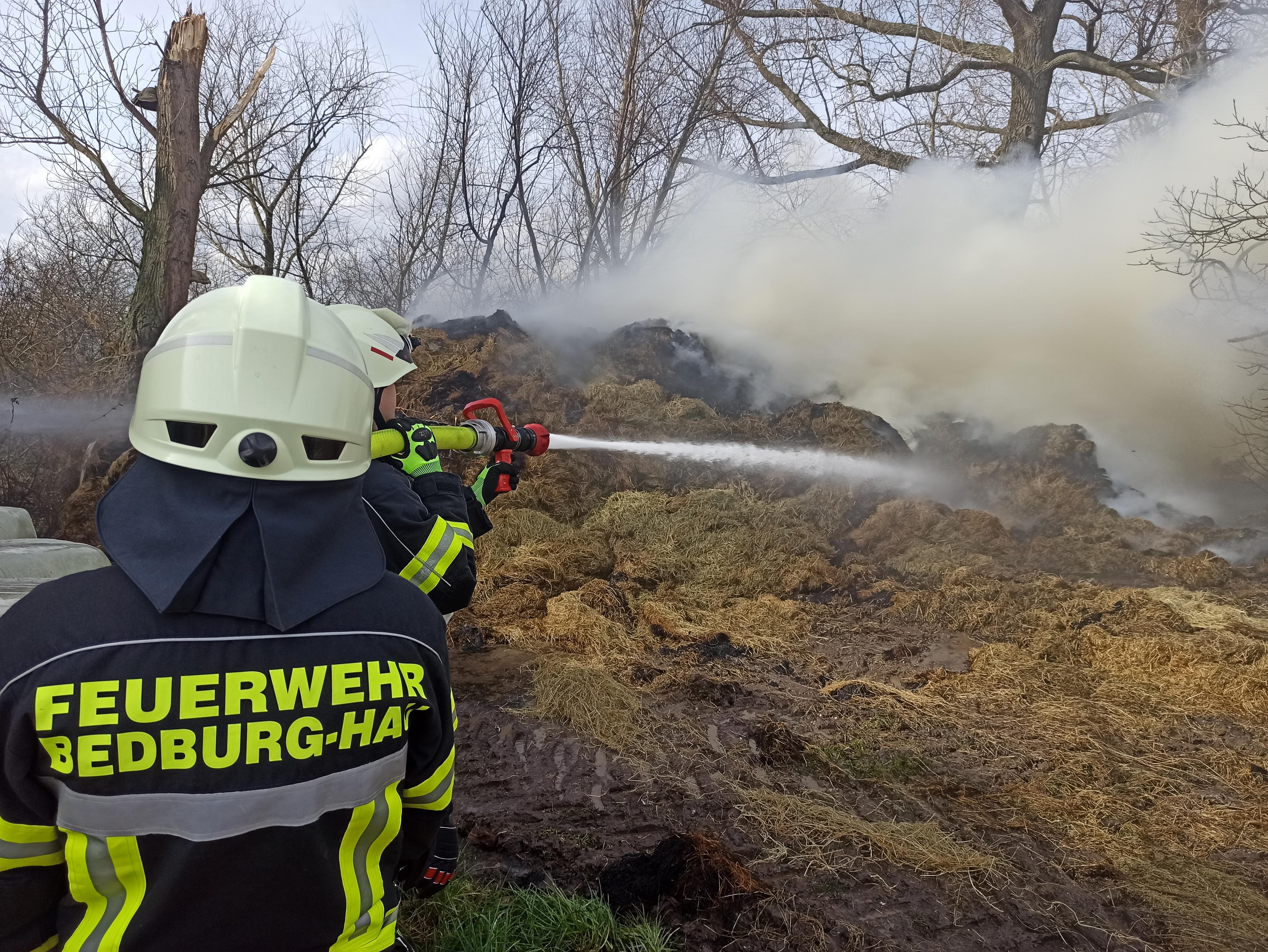 Zu einem Flächenbrand wurde die Freiwillige Feuerwehr Bedburg-Hau heute (12.03.2022) um 12:29 Uhr auf einem landwirtschaftlichen Betrieb an der Holzstraße alarmiert. Vor Ort brannten jedoch zahlreiche Wickelballen mit Heu. Durch die starke Rauchentwicklung kam es zwischenzeitlich zu erheblichen Sichtbehinderungen auf der Sommerlandstraße.