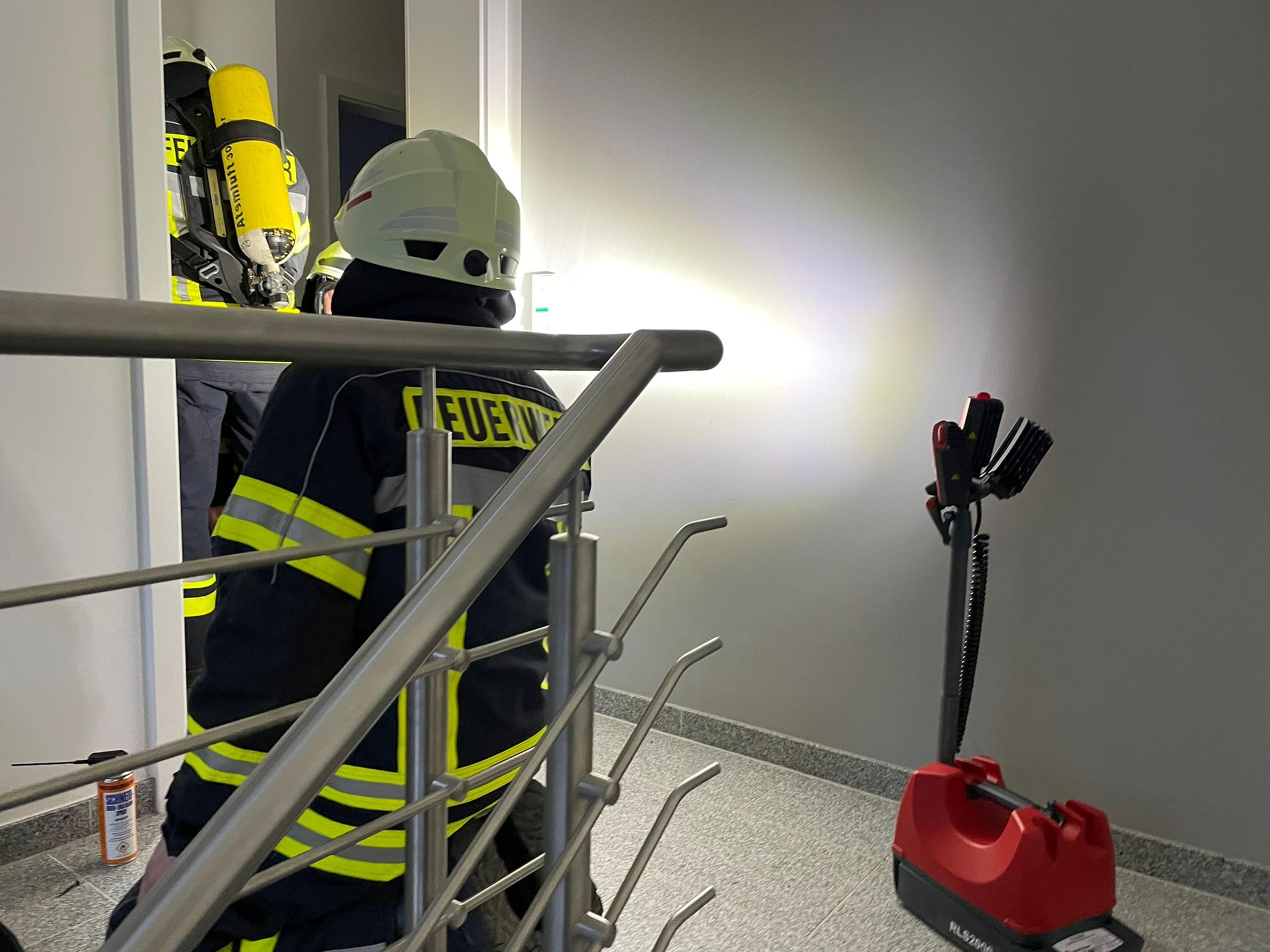 Beim Eintreffen war die Wohnung verschlossen und der Mieter nicht erreichbar. Wohnung im 1. OG wurde von der Vor- und Rückseite über zwei Steckleitern kontrolliert, Wohnungstüre mit Ziehfix geöffnet. Mit einem Angriffstrupp unter Atemschutz wurde die Wohnung kontrolliert - keine Feststellung.