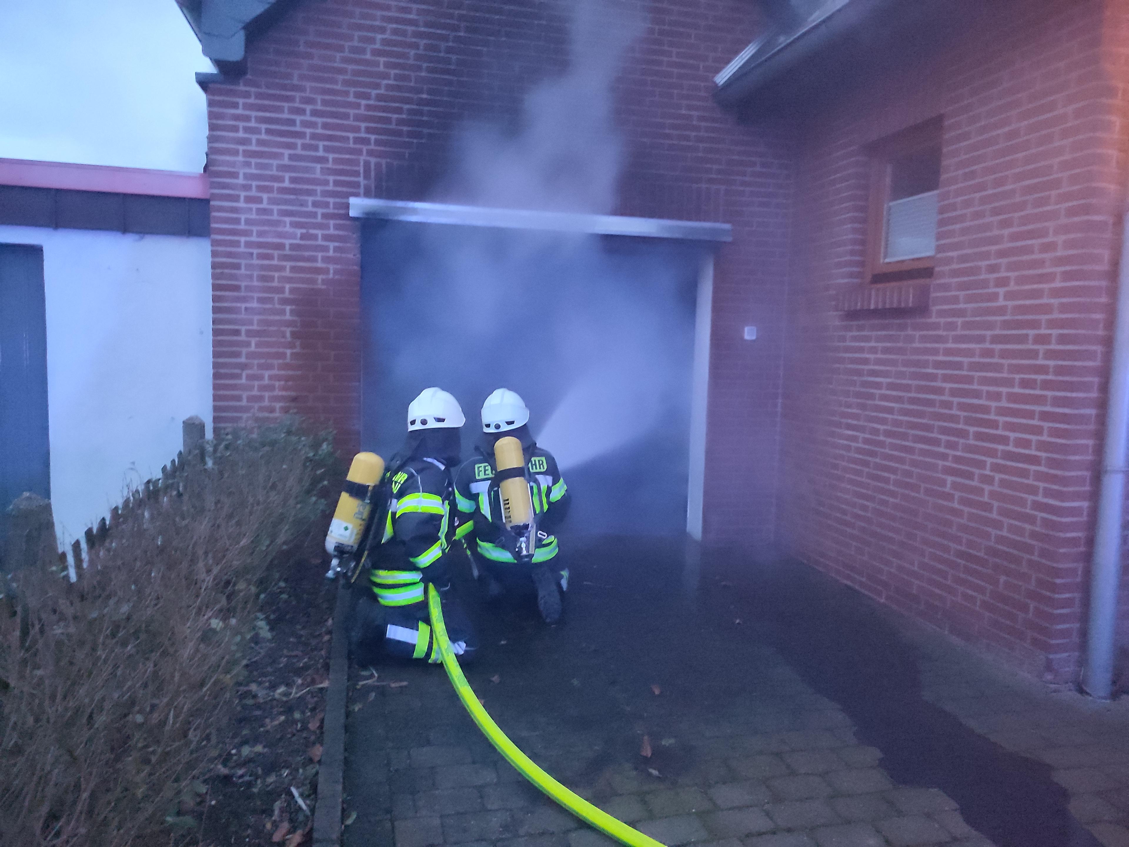 Beim Eintreffen der Feuerwehr gab es eine starke Rauchentwicklung durch in Brand geratene Reifen. Ein Angriffstrupp unter schwerem Atemschutz konnte mit einer C-Angriffsleitung das Feuer schnell unter Kontrolle bringen. Es blieb dadurch auf den Entstehungsraum begrenzt. Als Ursache kann ein Defekt in der elektrischen Installation der Garage nicht ausgeschlossen werden.