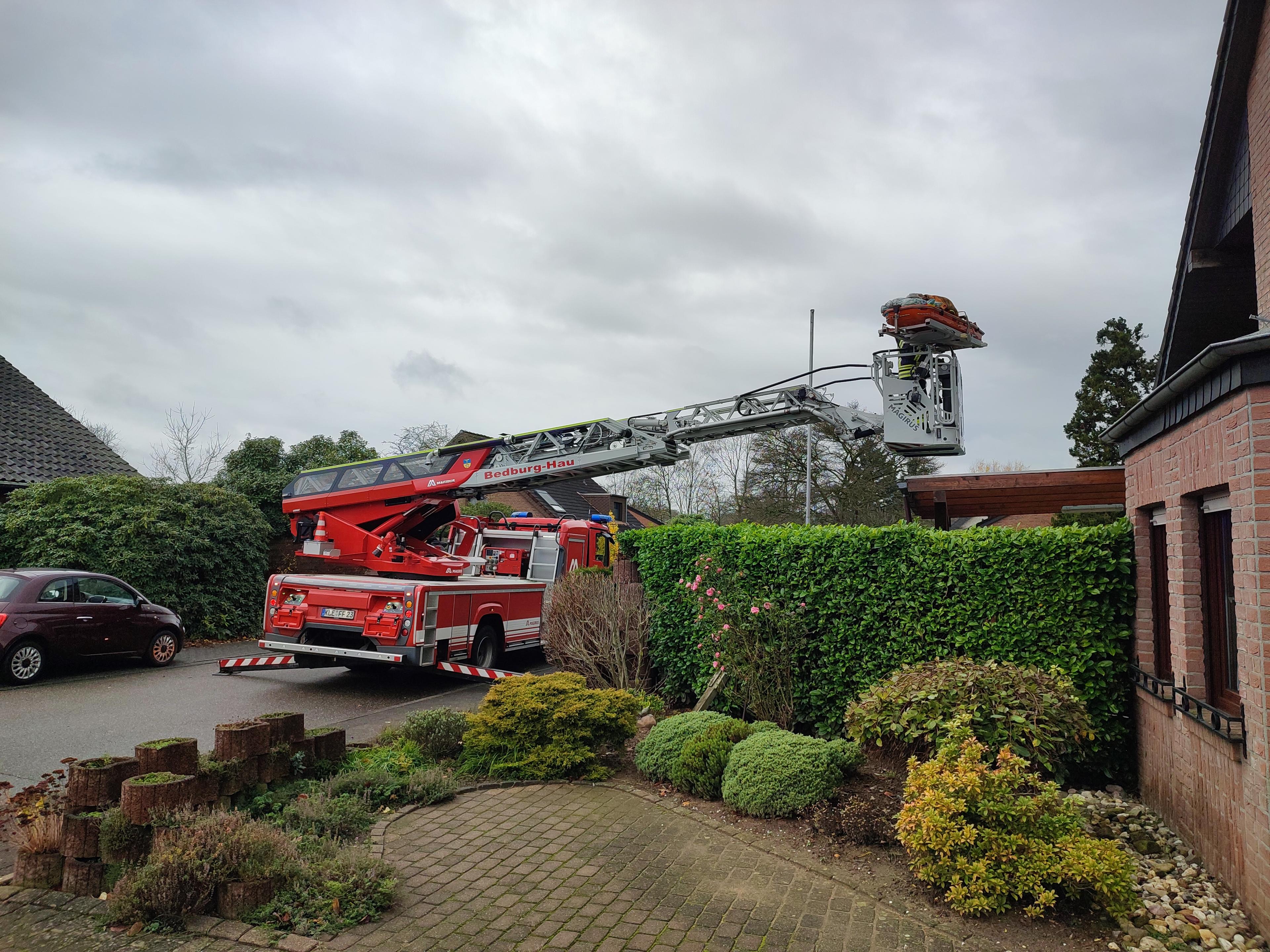 Zum schonenden Patiententransport aus dem ersten Obergeschoss unterstützten wir den Rettungsdienst mit der Drehleiter.