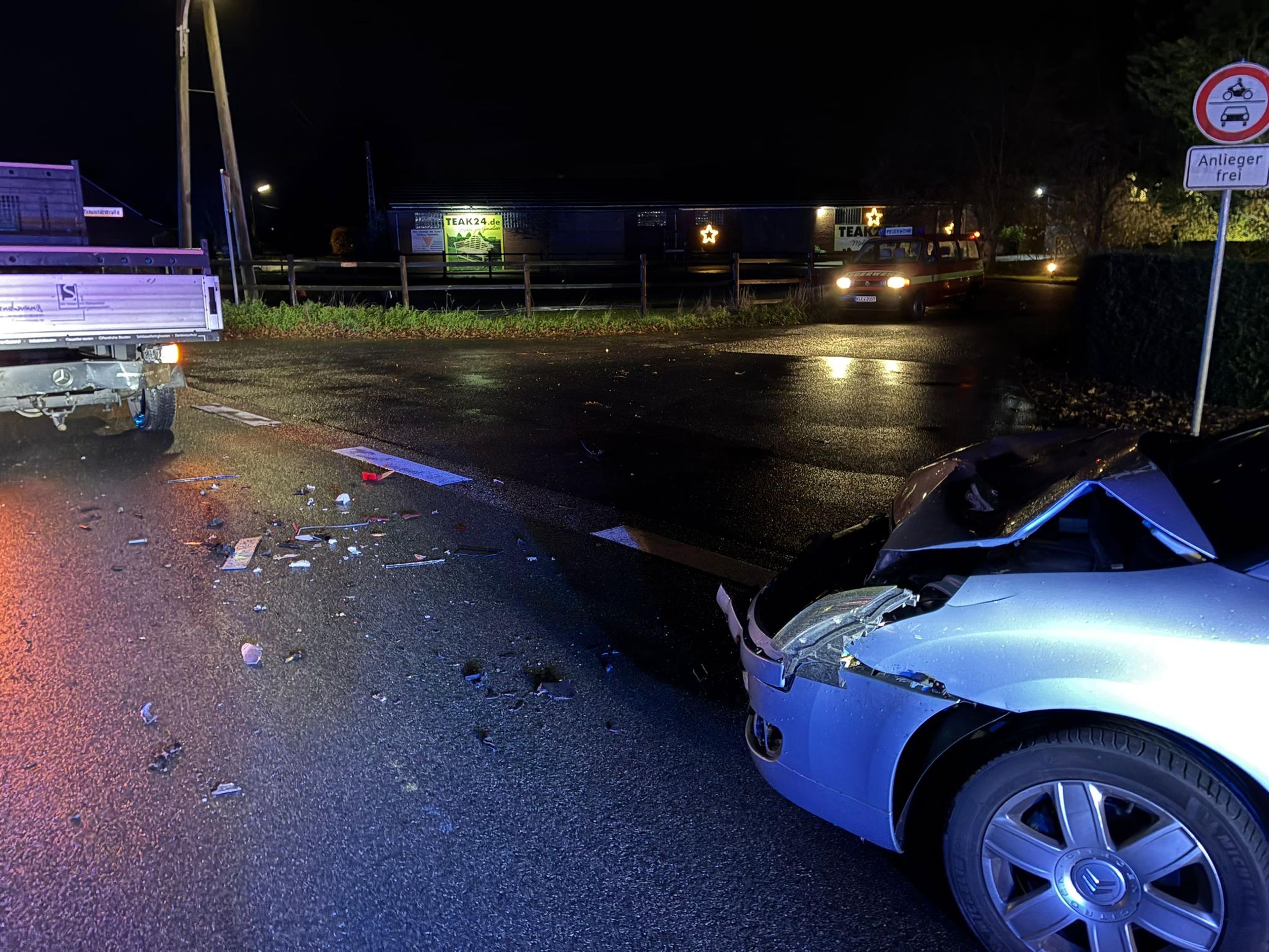 Verkehrsunfall mit zwei beteiligten Fahrzeuge. Auslaufende Betriebsstoffe wurden aufgenommen, der Brandschutz sichergestellt und die Unfallstelle abgesichert.