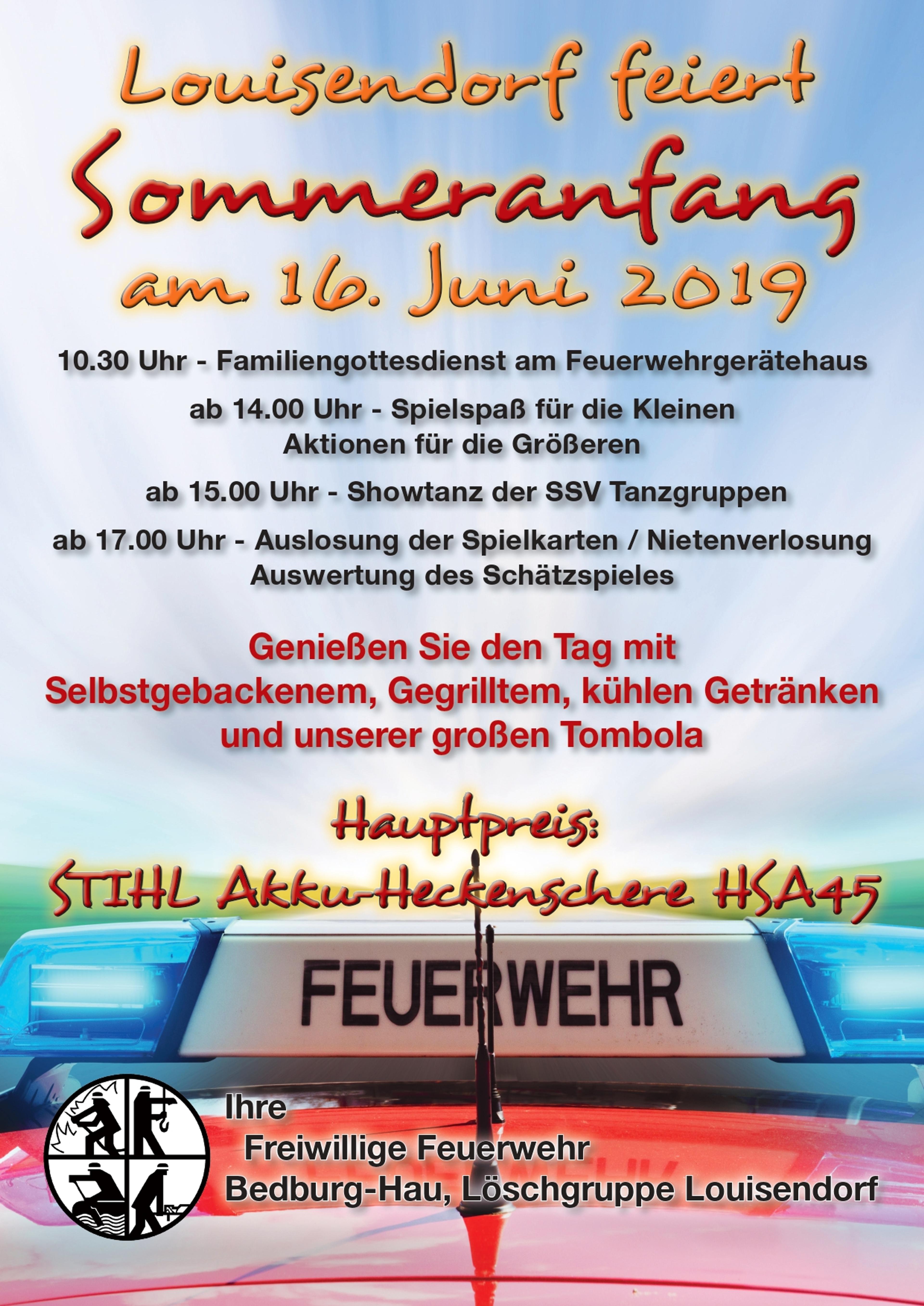 Zum 33. Mal feiert die Freiwillige Feuerwehr Bedburg-Hau ihr traditionelles Sommerfest in Louisendorf. Die Wehrmänner und -frauen laden am Sonntag, 16. Juni 2019, ab 10:30 Uhr ein. Gefeiert wird am Gerätehaus an der Hauptstraße. Herzlich willkommen sind alle großen und kleinen Feuerwehrbegeisterten.