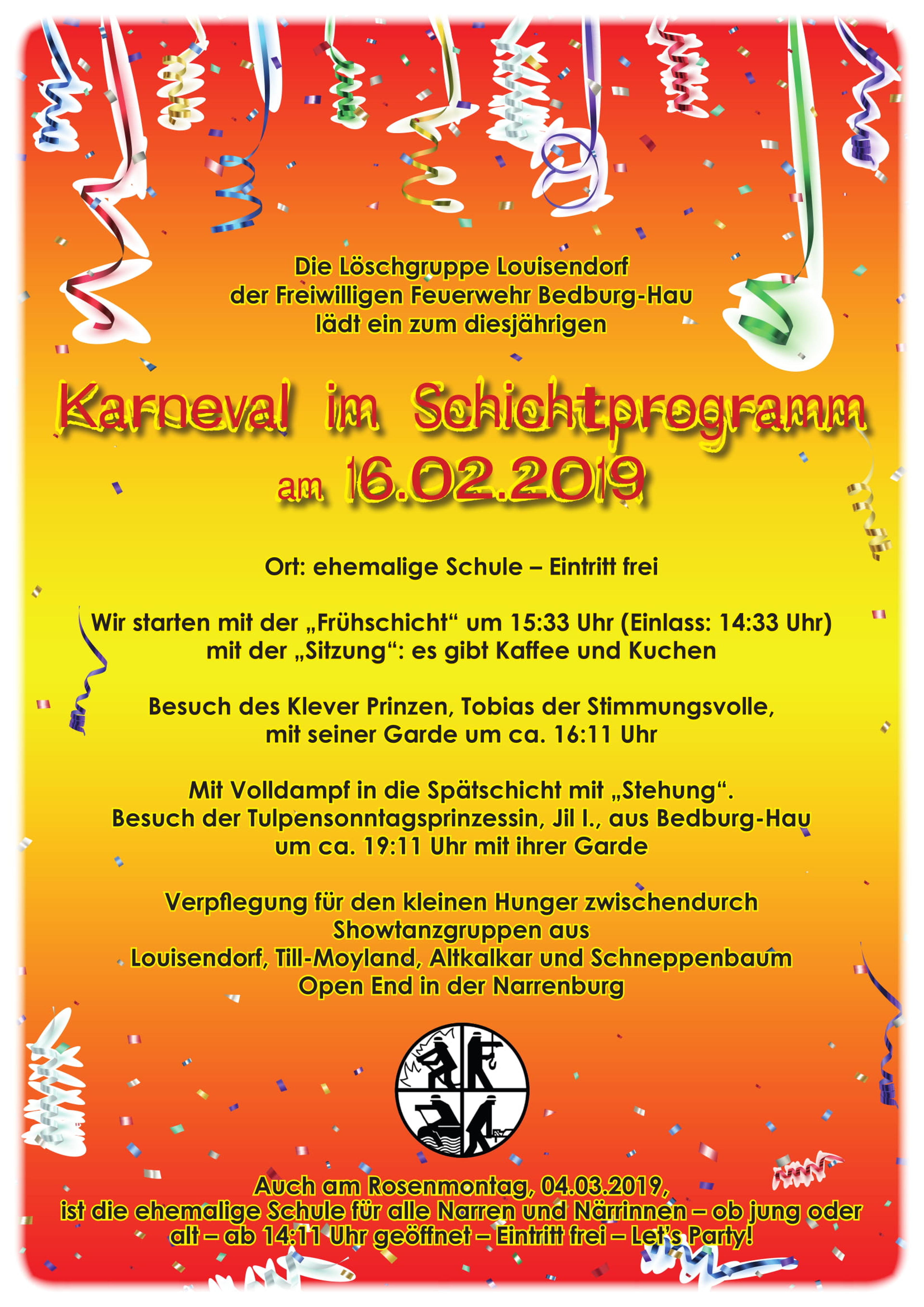 Unter dem Motto "Karneval im Schichtprogramm" startet auch die Freiwillige Feuerwehr Bedburg-Hau in die fünfte Jahreszeit. Ansonsten Retten, Löschen, Bergen und Schützen sie an 365 Tagen und sind rund um die Uhr für Bedburg-Hau im Einsatz. Freiwillig.
