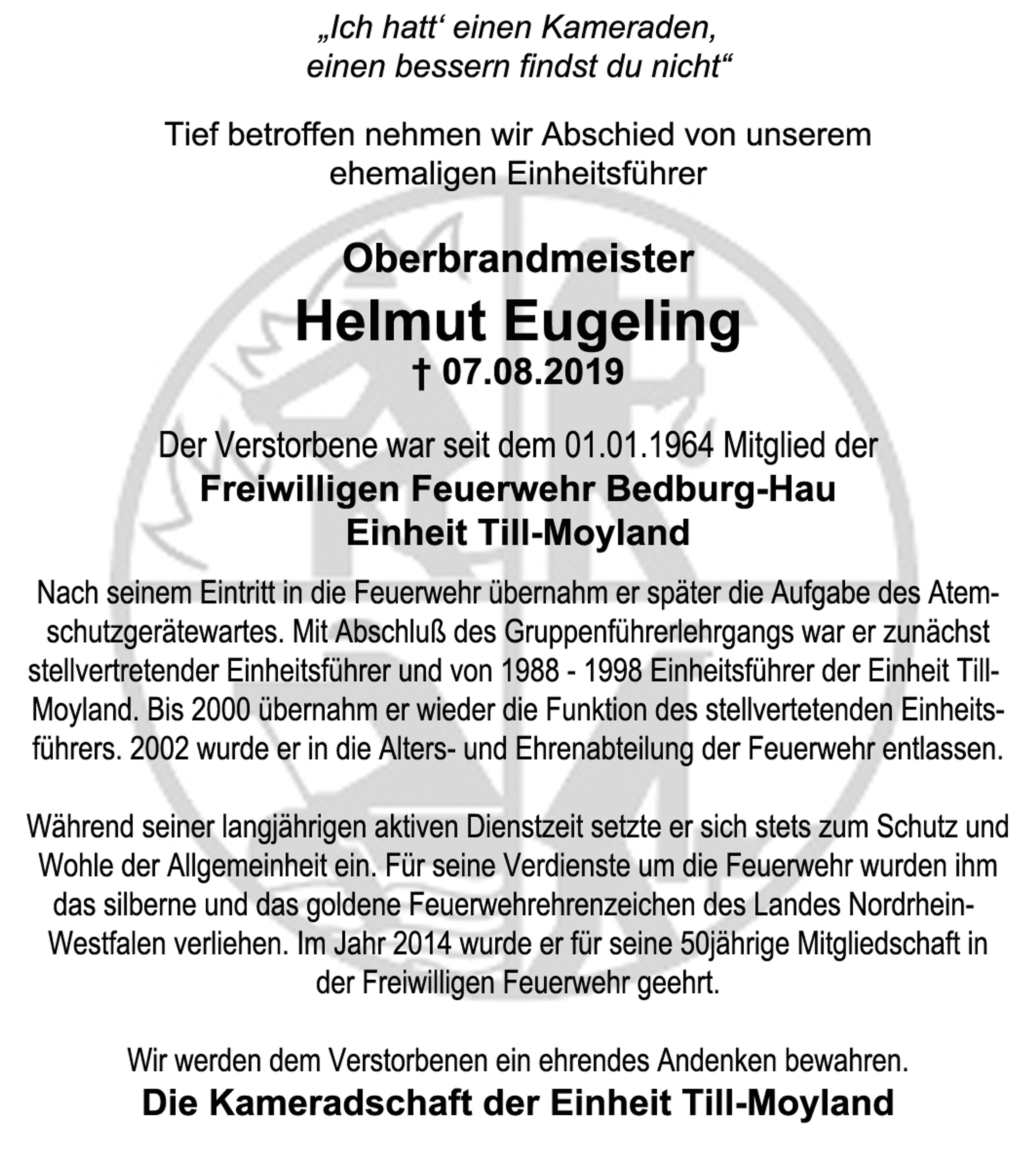 Die Freiwillige Feuerwehr Bedburg-Hau trauert um den ehemaligen Einheitsführer der Einheit Till-Moyland, Oberbrandmeister Helmut Eugeling, welcher am 07.08.2019 nach schwerer Krankheit verstarb. Der Verstorbene trat am 01.01.1964 in die Freiwillige Feuerwehr Bedburg-Hau ein.