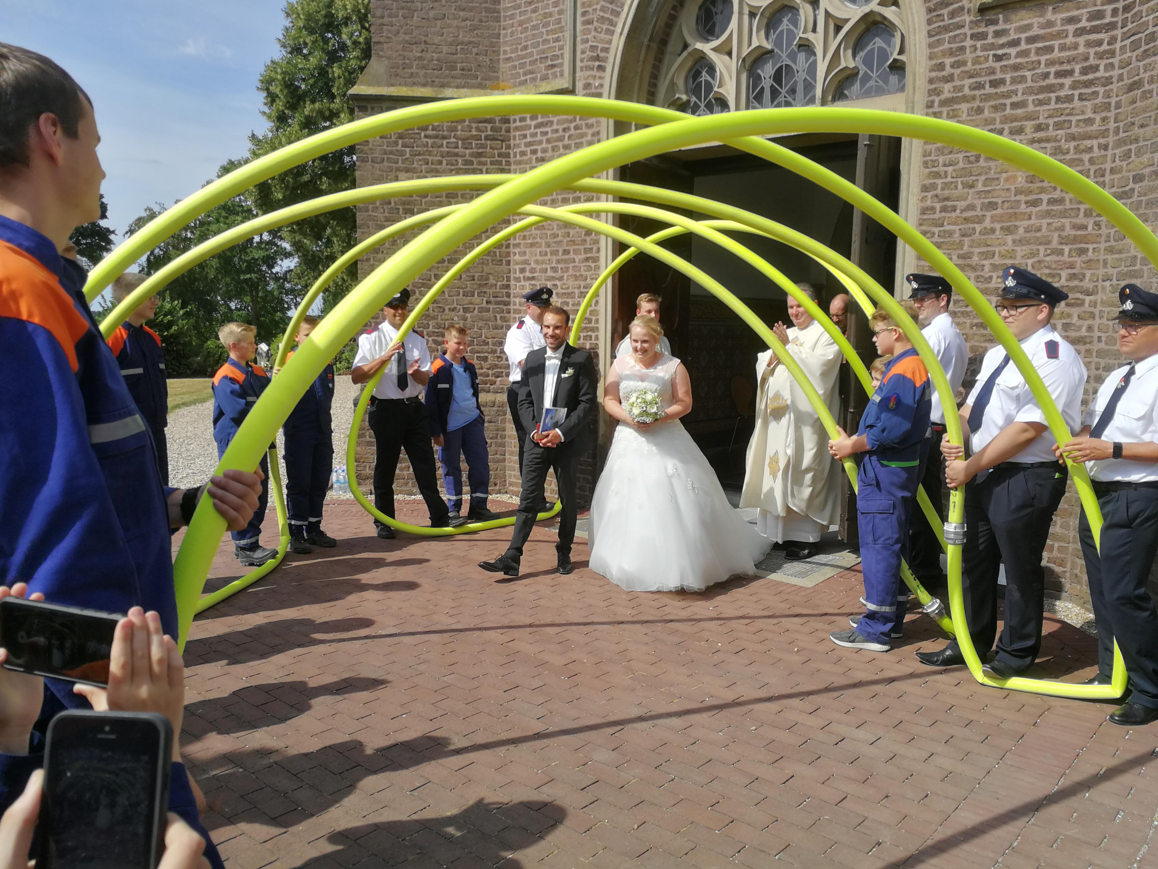 Anlässlich der kirchlichen Hochzeit von Tim und Nicole Veldmeijer bildeten die Kameraden der Einheit Qualburg und der Jugendfeuerwehr ein Ehrenspalier an der St. Martinus Pfarrkirche zu Qualburg.