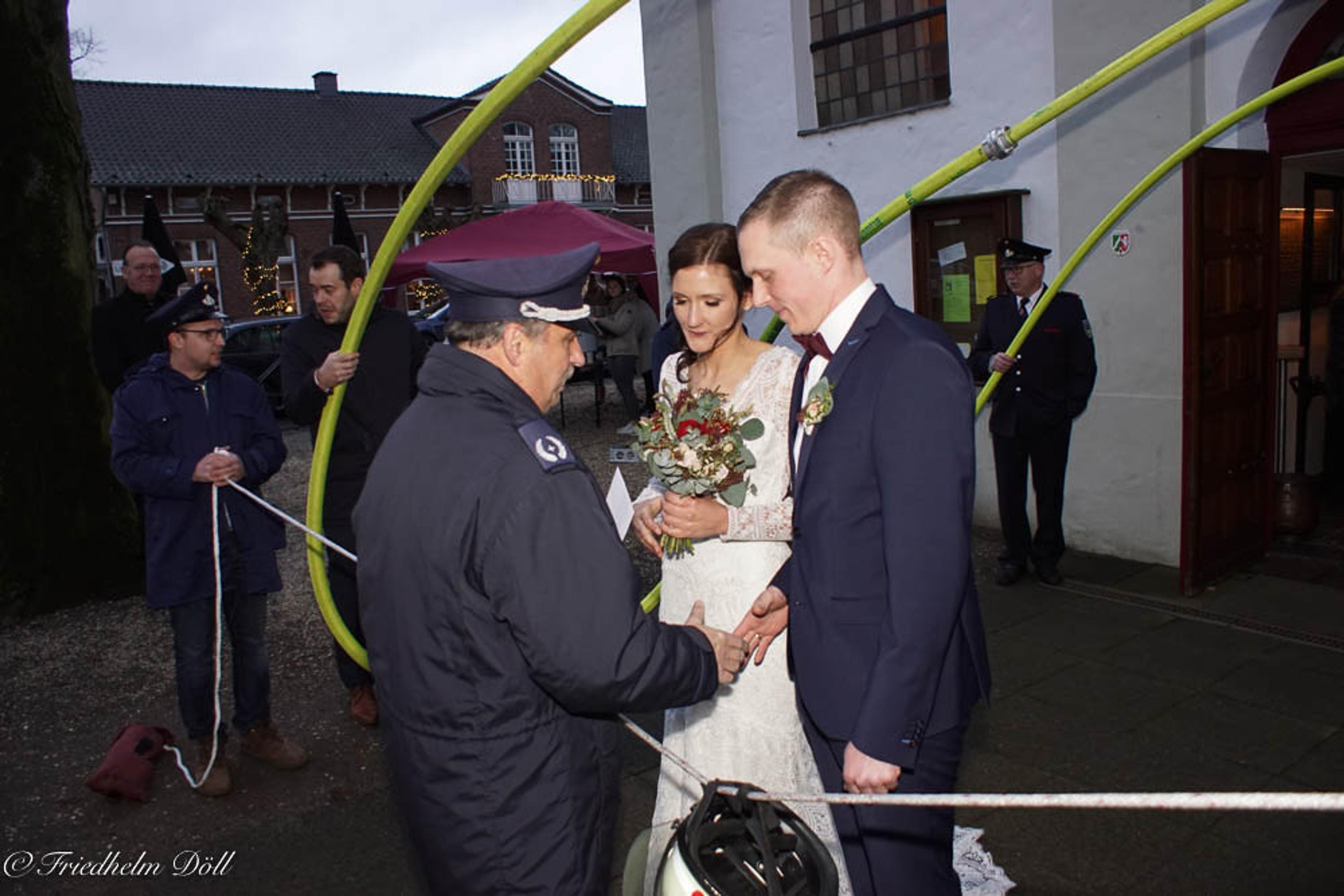 Einsatz der besonderen Art für die Einheit Till-Moyland am vorletzten Tag des alten Jahres. Selbstverständlich bildeten die Kameraden ein Spalier, als Unterbrandmeister Johannes van de Loo und seine frisch angetraute Ehefrau Simone nach dem Ja-Wort die Schlosskirche Moyland verließen. Die Kameradinnen und Kameraden der Freiwilligen Feuerwehr Bedburg-Hau schließen sich den Glückwünschen an und wünschen dem jungen Paar eine glückliche, harmonische, einmalig wertvolle und unverwechselbare Ehe sowie nicht zuletzt auch Gottes Segen.
