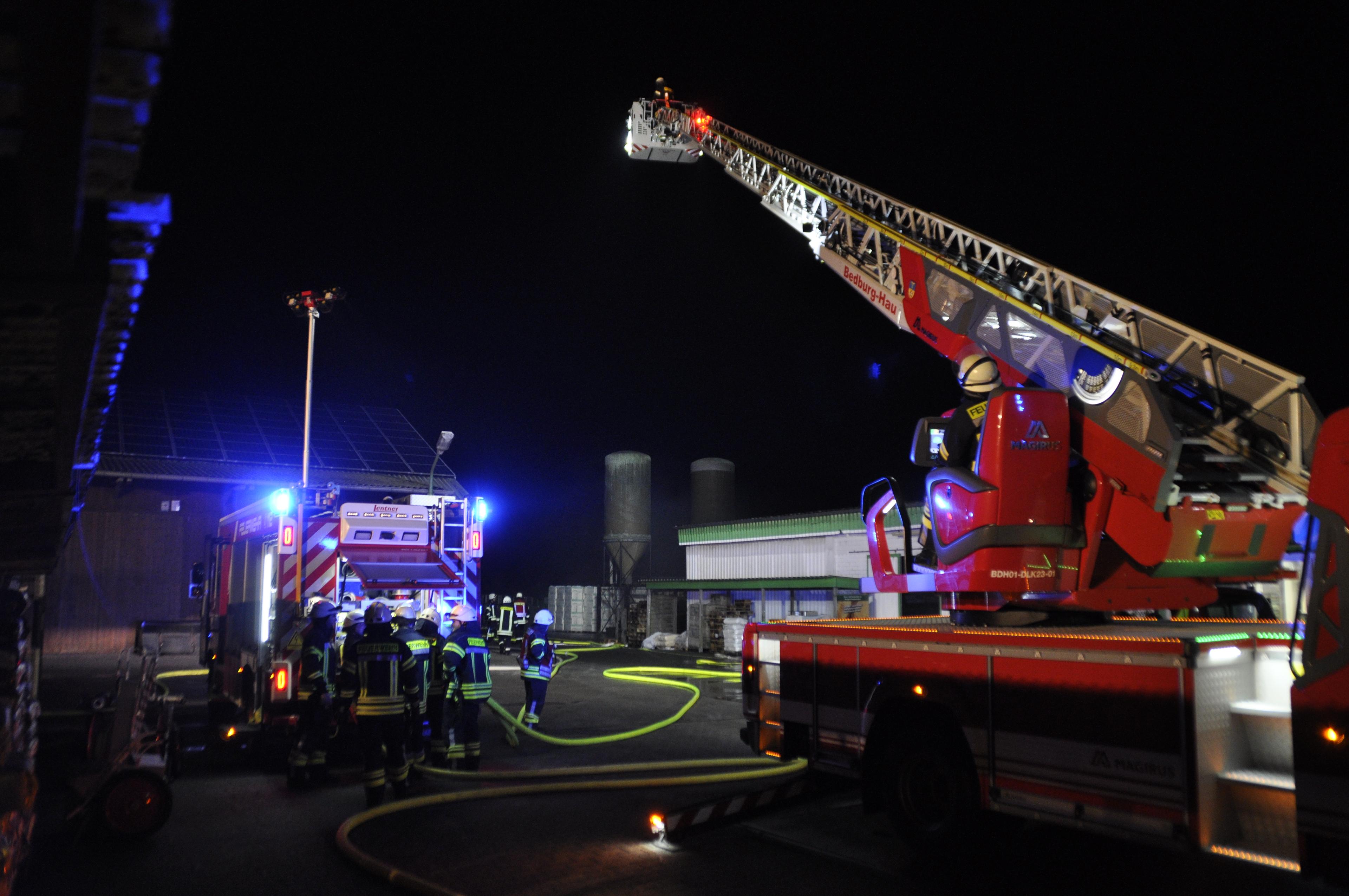 30 Einsatzkräfte der Freiwilligen Feuerwehr Bedburg-Hau trainierten heute den Ernstfall. Mit Blaulicht rasen mehrere Löschfahrzeuge die Straße entlang. Den Einsatzort ist diesmal leicht zu finden. Es brennt in einer Halle auf dem Gelände des Raiffeisenmarktes an der Gocher Straße in Louisendorf.