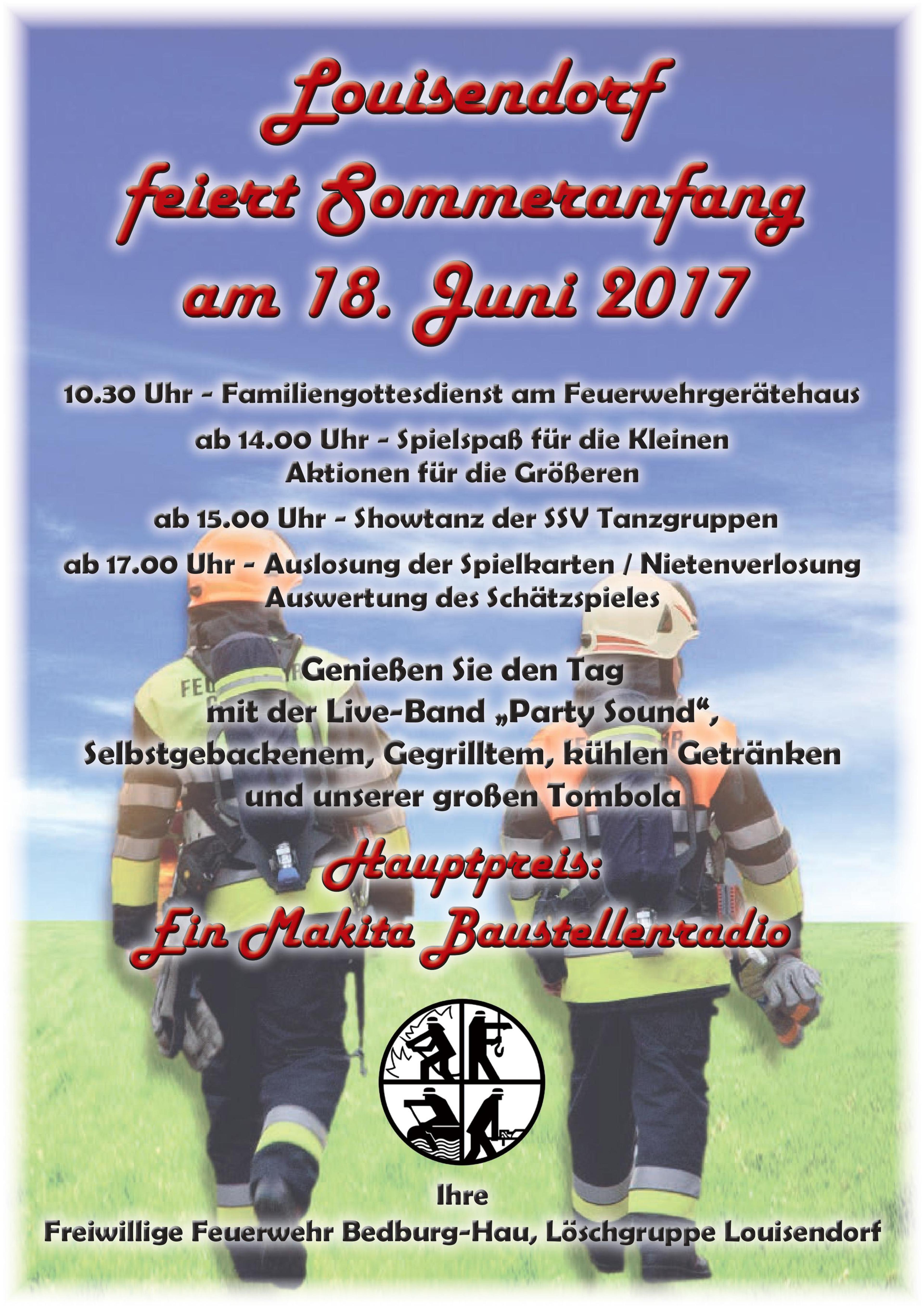 Zum 31. Mal feiert die Freiwillige Feuerwehr Bedburg-Hau ihr traditionelles Sommerfest in Louisendorf. Die Wehrmänner und -frauen laden am Sonntag, 18. Juni, ab 10:30 Uhr ein. Gefeiert wird am Gerätehaus an der Hauptstraße. Herzlich Willkommen sind alle großen und kleinen Feuerwehrbegeisterten.