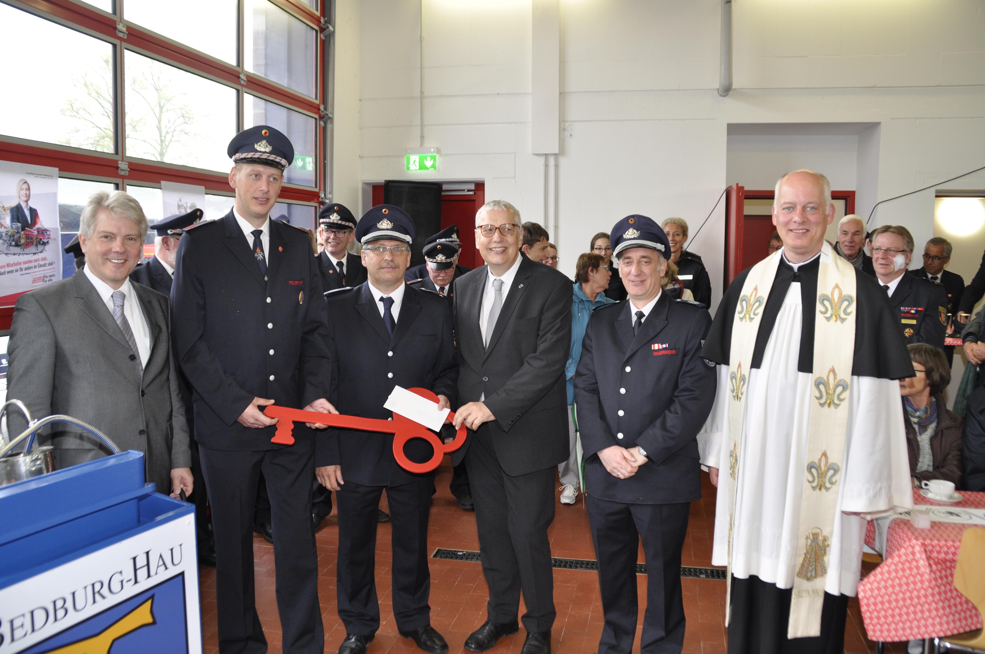Festakt auf dem Dorfplatz in Till-Moyland: Heute Vormittag wurde das neue Feuerwehrgerätehaus eingeweiht. Wehrleiter Stefan Veldmeijer betonte, dass die Feuerwehr, keine Freizeiteinrichtung für technikbegeisterte Menschen sei, sondern zur unverzichtbaren Infrastruktur für die Bürgerinnen und Bürger der Gemeinde gehöre.