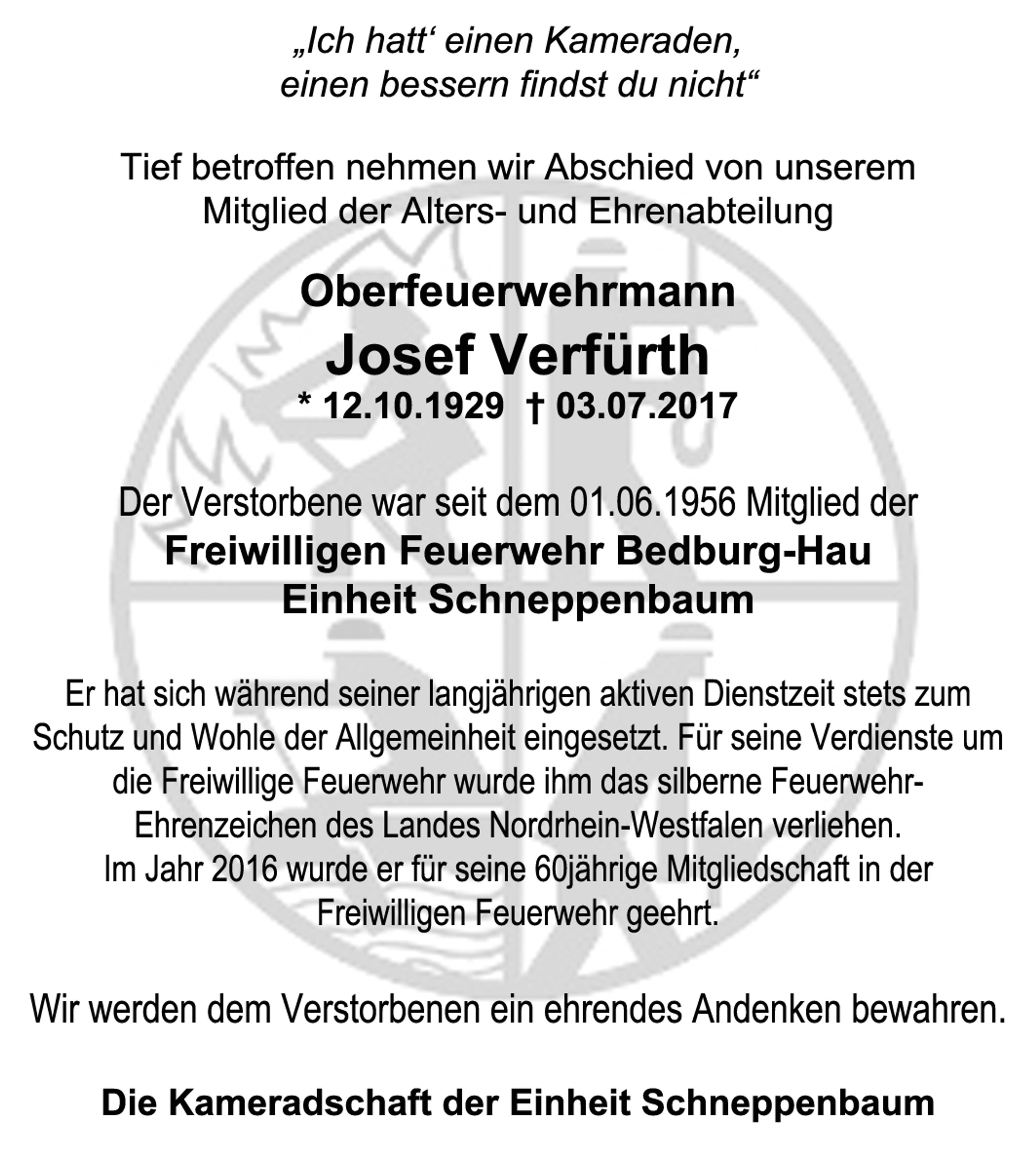 Die Freiwillige Feuerwehr Bedburg-Hau trauert um Josef Verfürth