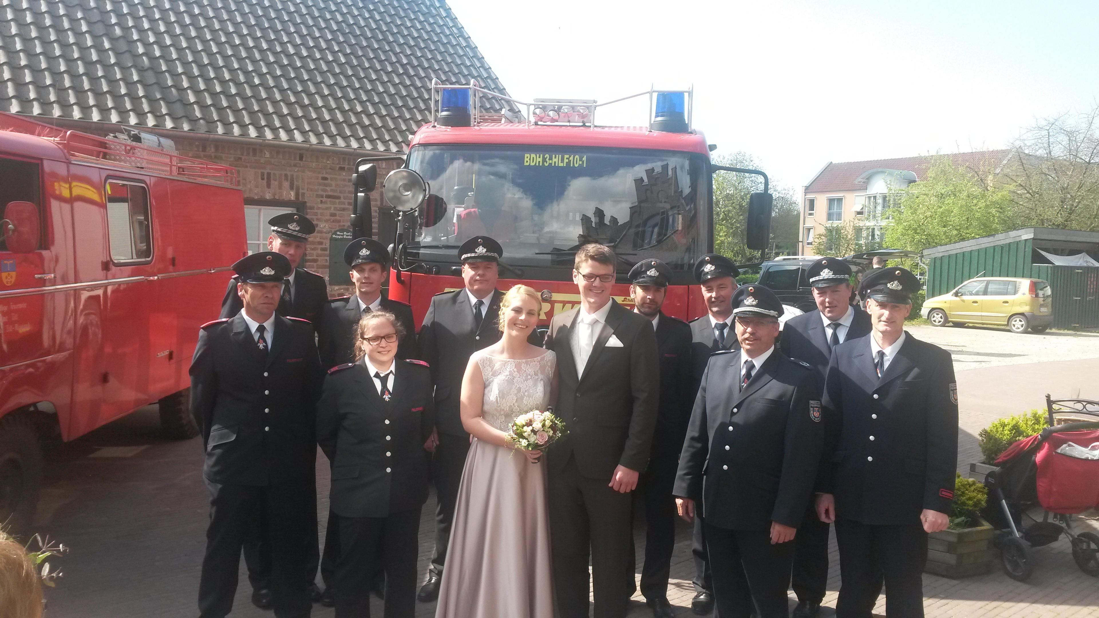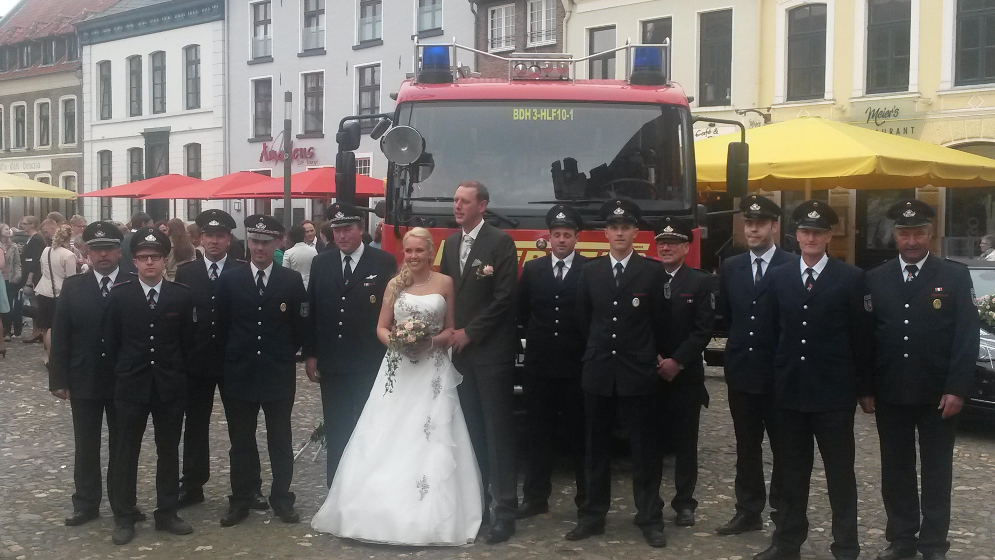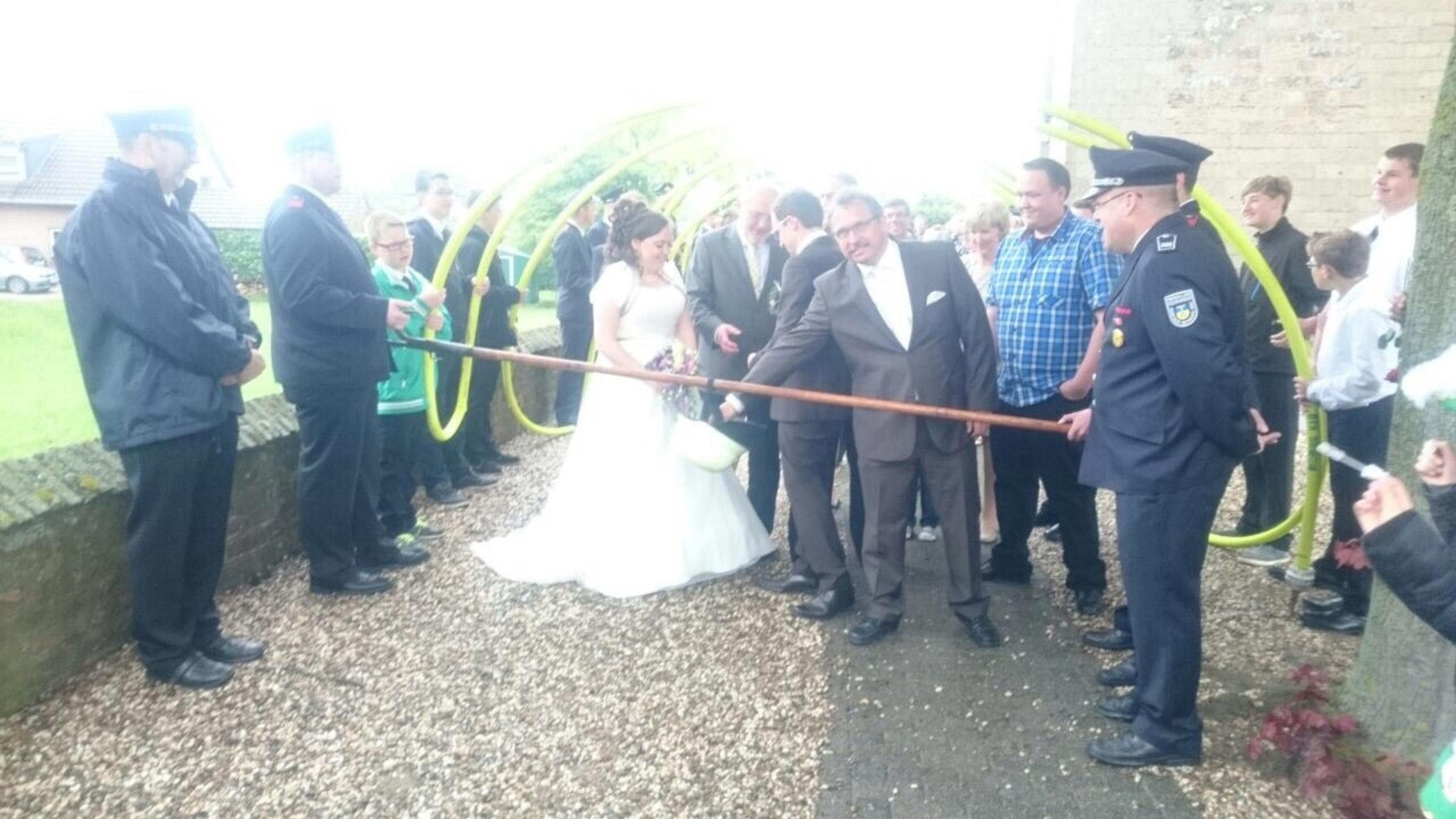 Stellt man sich die Frage, was Feuerwehr eigentlich ist oder bedeutet, gibt es zwei Sichtweisen. Aus der Sichtweise der Bürger, die sich auf die Feuerwehr, also auf uns, verlassen. Zu jeder Tages- und Nachtzeit. Sie wollen Rettung und Hilfe aus der Not. Ja, das können wir bieten. Und darauf sind wir stolz. Aber was bedeutet Feuerwehr für uns, die Angehörigen der Feuerwehr? Sicherlich ein Hobby, eine Berufung. Aber letztendlich mehr. Feuerwehr ist Zusammenhalt und Kameradschaft. Wir können uns gegenseitig vertrauen und auf uns verlassen. Feuerwehr ist aber für uns auch Familie. So durchleben wir durch das Jahr schöne aber auch manchmal traurige Momente. Wie in einer echten Familie halt. [more] Diese Woche durften wir gemeinsam einen schönen Moment teilen. Unser Kamerad Markus Geurds aus der Löschgruppe Till-Moyland wurde standesgemäß zur Hochzeit und in die Ehe begleitet. Seine Frau, Kim, ist somit auch ein richtiger Teil unserer Feuerwehrfamilie geworden.