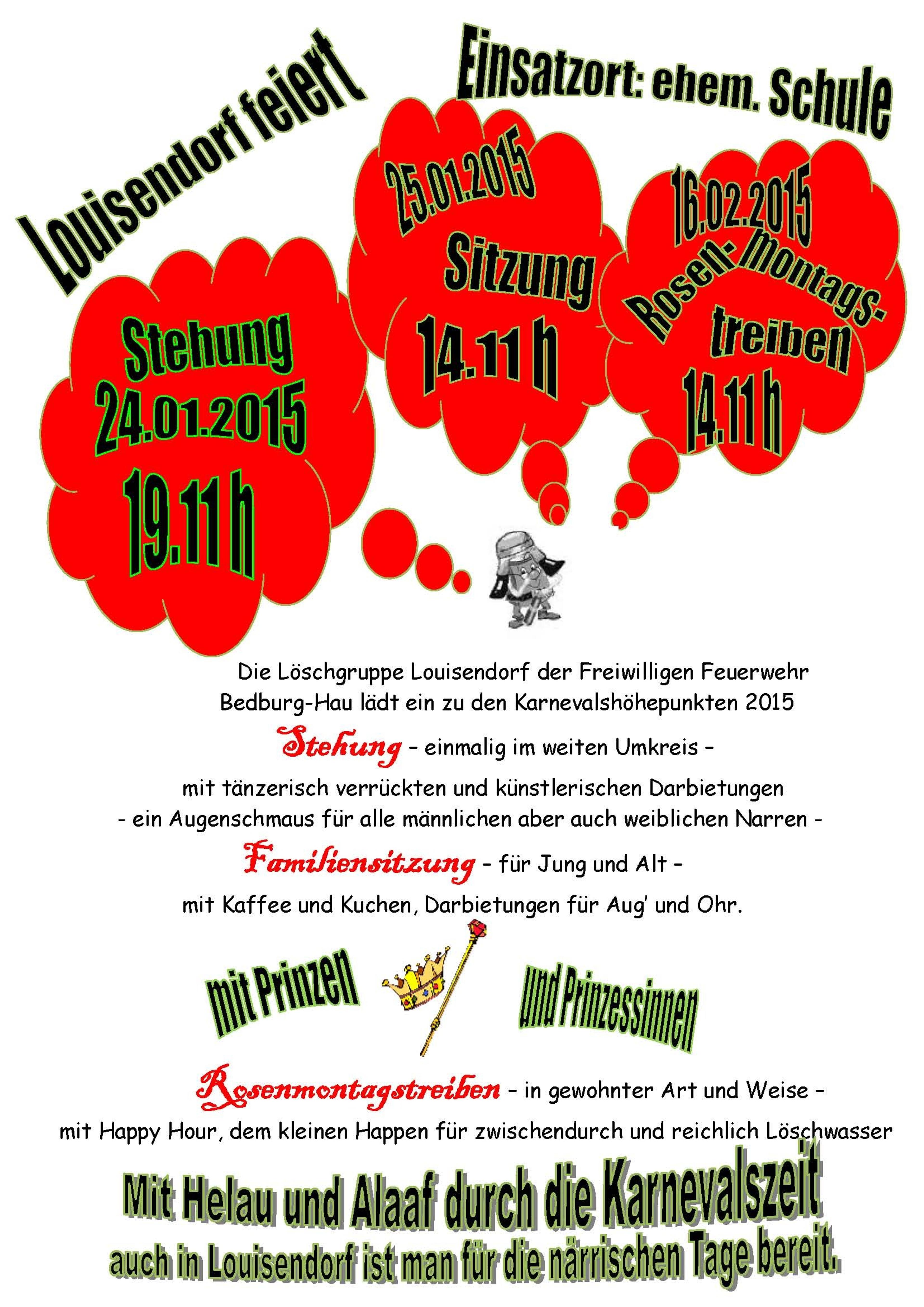 Tanzen, feiern, fröhlich sein, beim Louisendorfer Karneval bleibt keiner allein - unter diesem Motto lädt die Löschgruppe Louisendorf der Freiwilligen Feuerwehr Bedburg-Hau am 16.02.2015 zum traditionellen Rosenmontagstreiben ein. Ab 14:11 Uhr startet die Party in der ehemaligen Schule an der Hauptstraße, nahe dem Sportplatz. Eingeladen ist jeder. Die Wehrmänner und - frauen freuen sich auf zahlreiche närrische Gäste, denn für gute Stimmung und beste Bewirtung ist gesorgt.